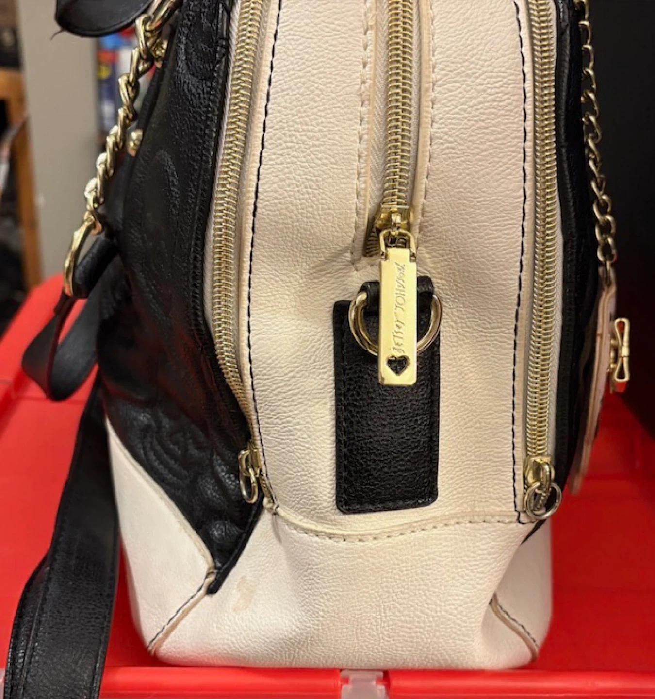 This Betsey Johnson satchel is so stylish! The bag is black and white with a skull pattern. It also has a cute pink skull charm. 15”X 10”X 5.5”. Two of the side zipper pulls are missing but the zippers are still 100% functional. Overall condition reflected in price 🤩