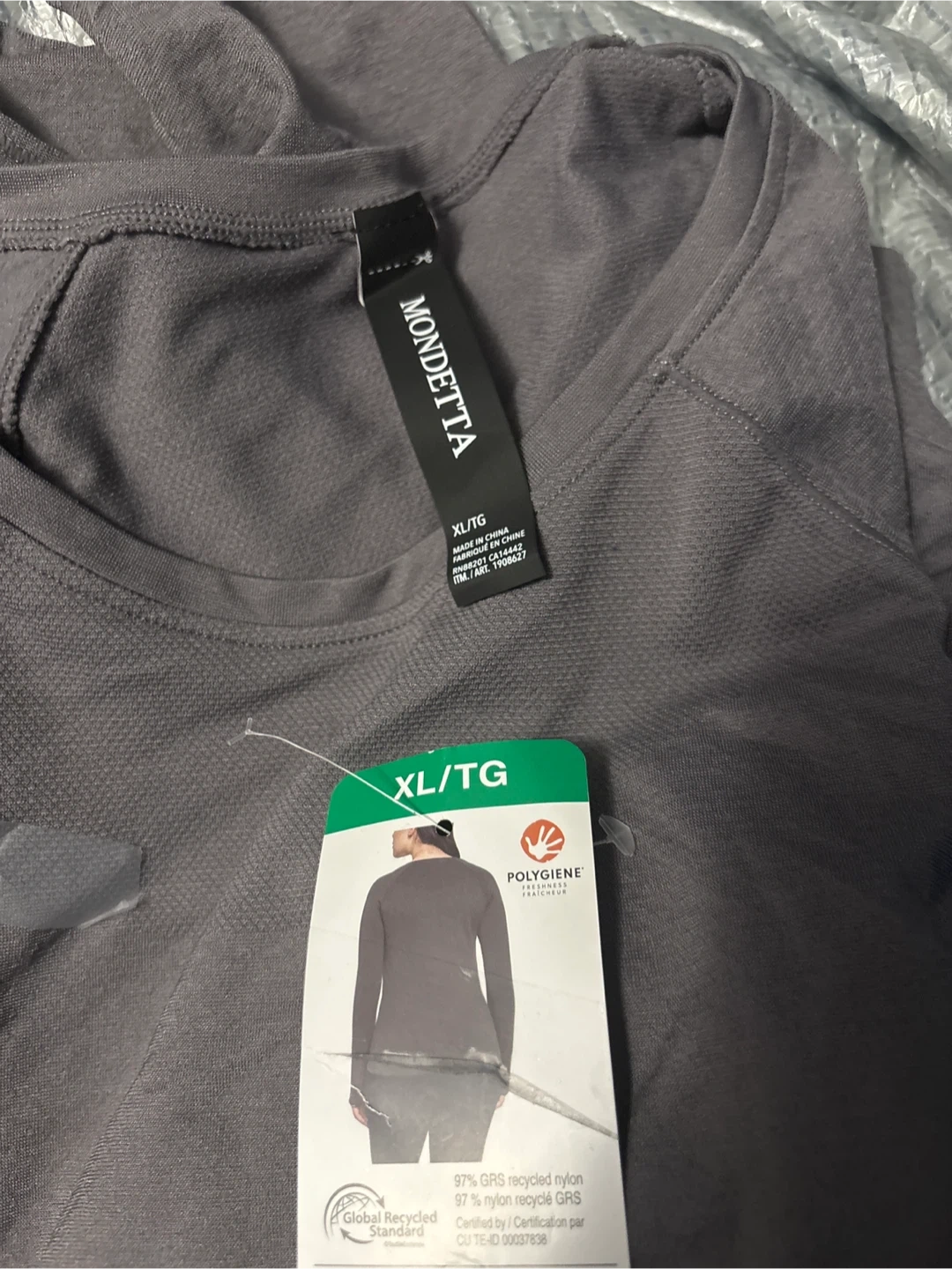 Selling a brand new Mondetta top, still with tags attached! It's a lovely grey colour and size XL/TG. The material is 97% GRS recycled nylon and 97% nylon recyclé GRS. A great addition to your wardrobe!