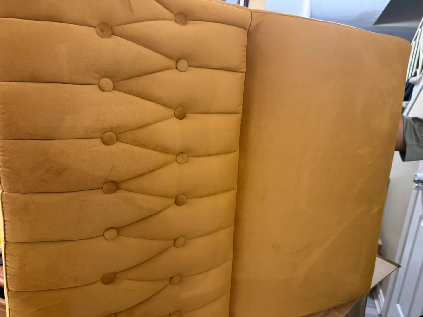Selling a mustard yellow headboard with a tufted design! It's in great condition and would add a pop of colour to any bedroom. The material feels soft and luxurious. Perfect for adding a touch of elegance to your space