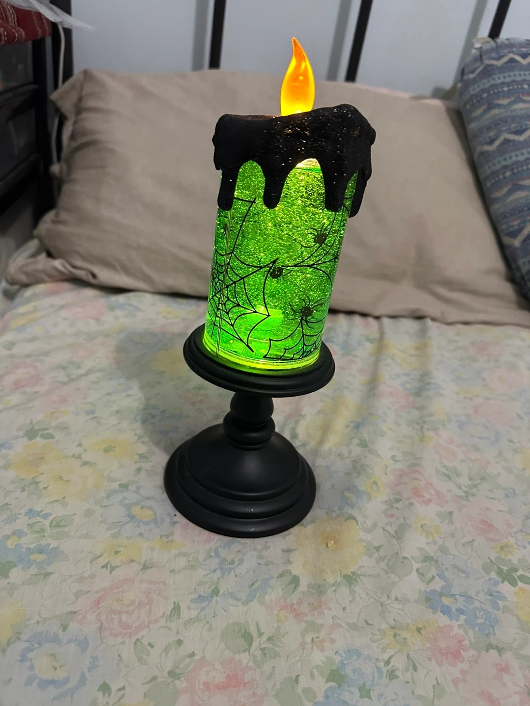 248Add a spooky touch to your Halloween decor with this fun glitter candle! It features a vibrant green colour with spiderweb designs and a flickering flame effect. Perfect for creating a festive atmosphere in your home this Halloween season