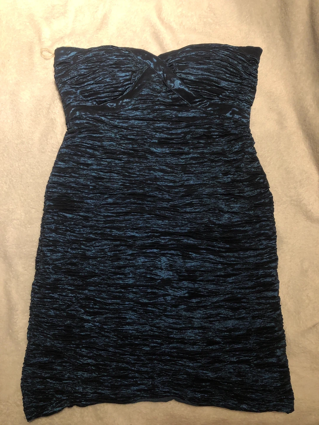 Selling a beautiful blue strapless dress! It's in great condition and ready for a new home. The dress has a unique textured pattern that adds a touch of elegance.