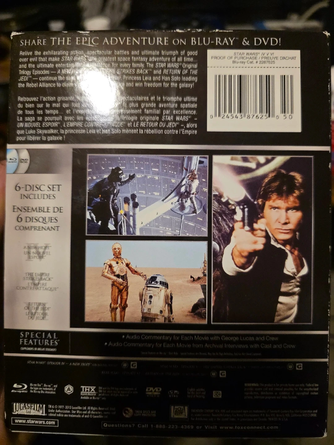 Selling a Star Wars Original Trilogy 6-disc set on Blu-ray and DVD. Includes Episodes IV, V, and VI. Enjoy the epic adventure with special features and audio commentary!