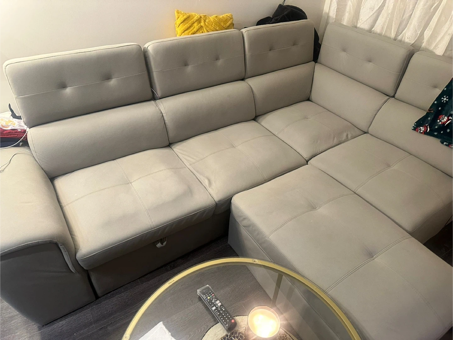 Selling a convertible sectional sofa in beige. It's in great condition and ready for a new home! It features a pull-out bed for guests and offers lots of seating space for the whole family. The original price was $1799