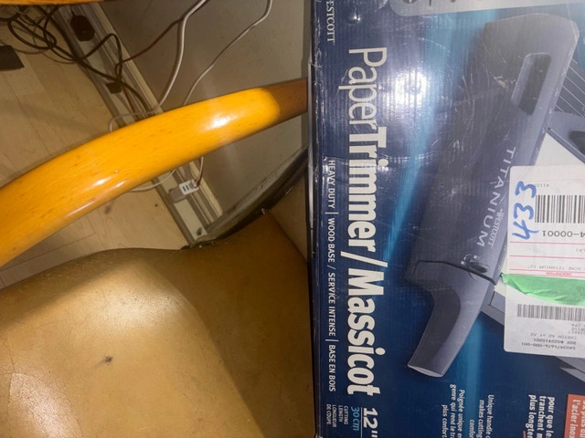 This Westcott Titanium paper trimmer is perfect for home or office use, featuring a heavy-duty wood base and a 12-inch (30cm) cutting length. The item is in like-new condition, complete with the original box.