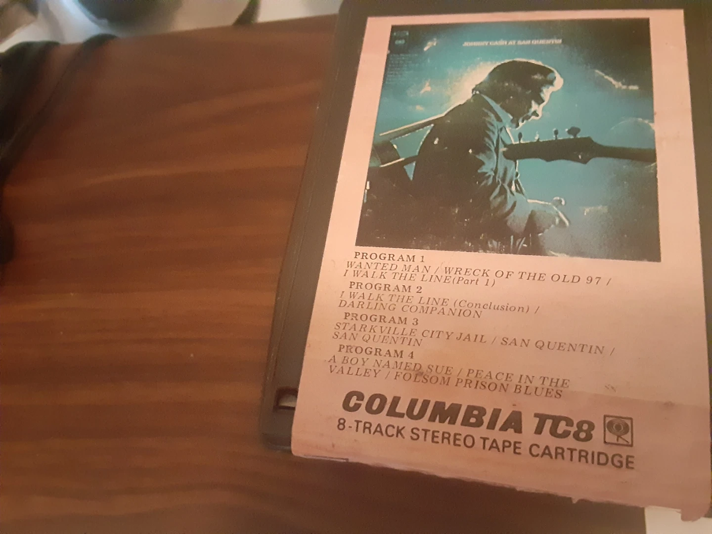 8 Track player with a woodgrain finish. It comes with multiple 8-track tapes including Bill Anderson, Johnny Cash, and The Statler Brothers. Made in Japan.