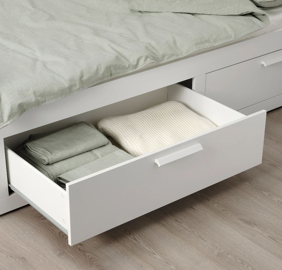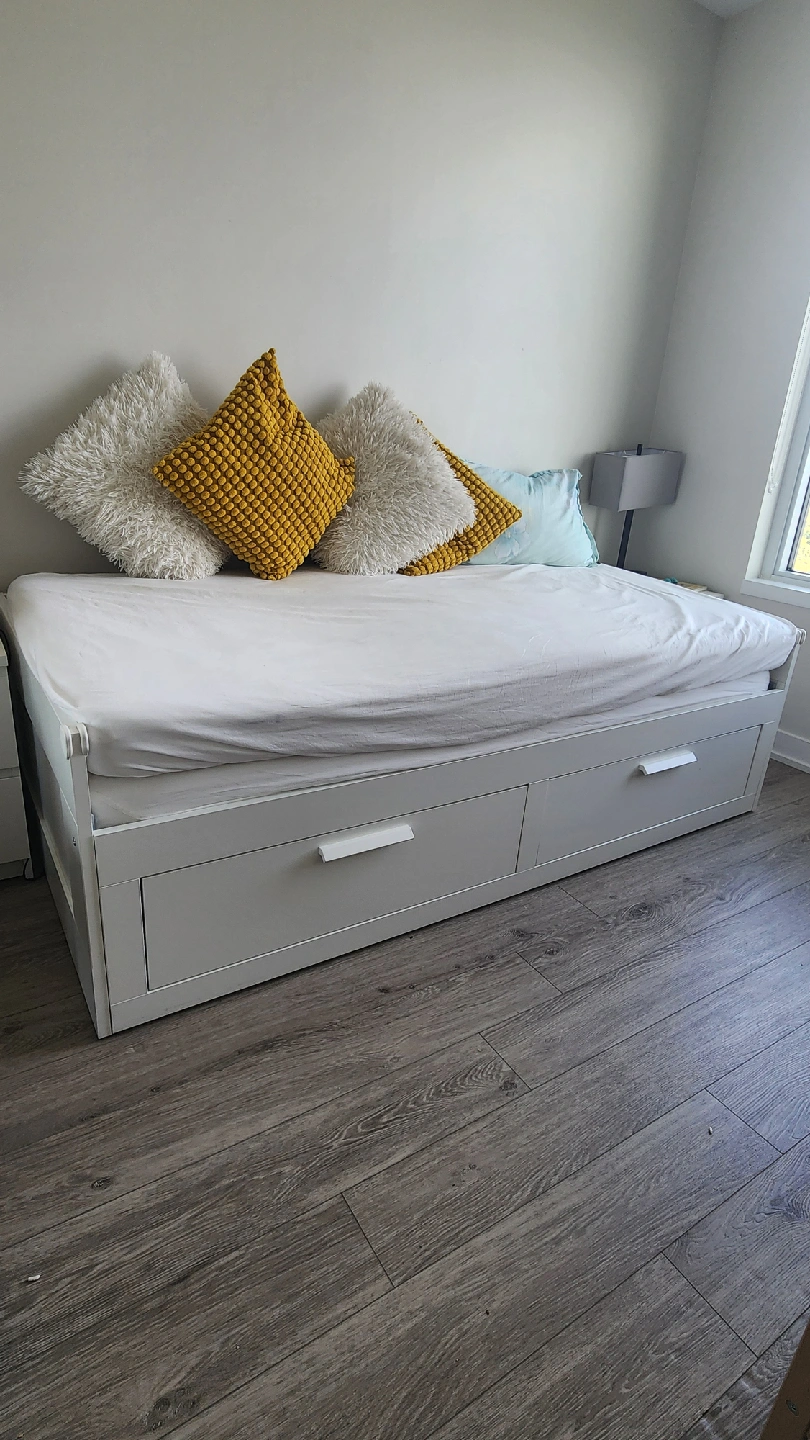 Selling an IKEA Brimnes daybed in white! It comes with two drawers, perfect for extra storage. The daybed can also be pulled out to create a larger sleeping space. Great for a guest room or a small apartment!