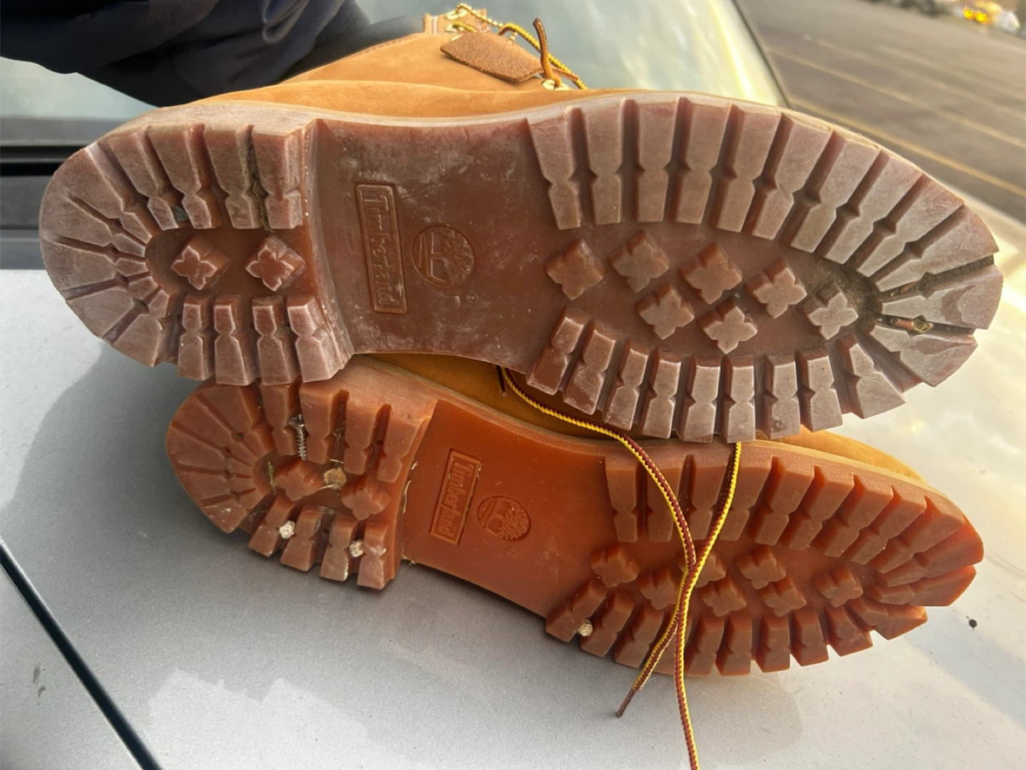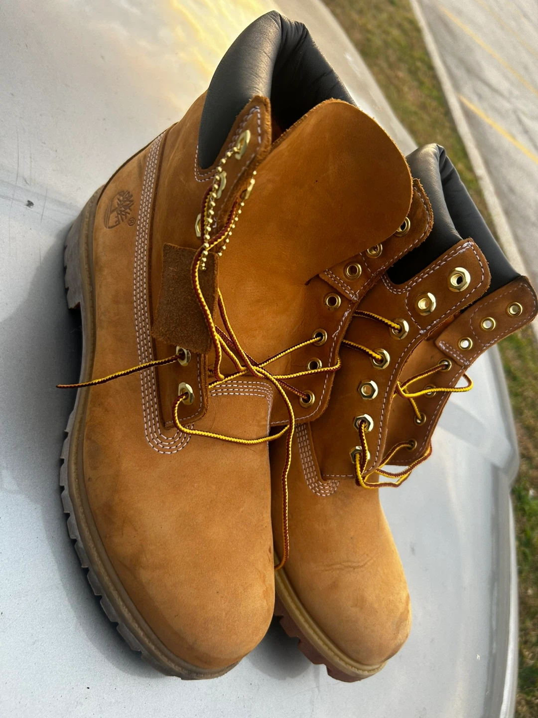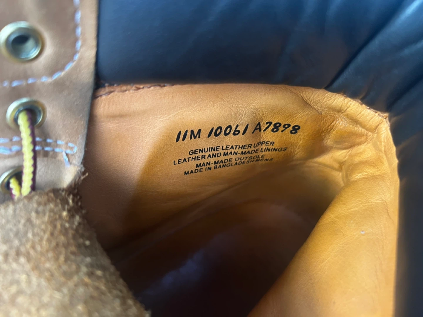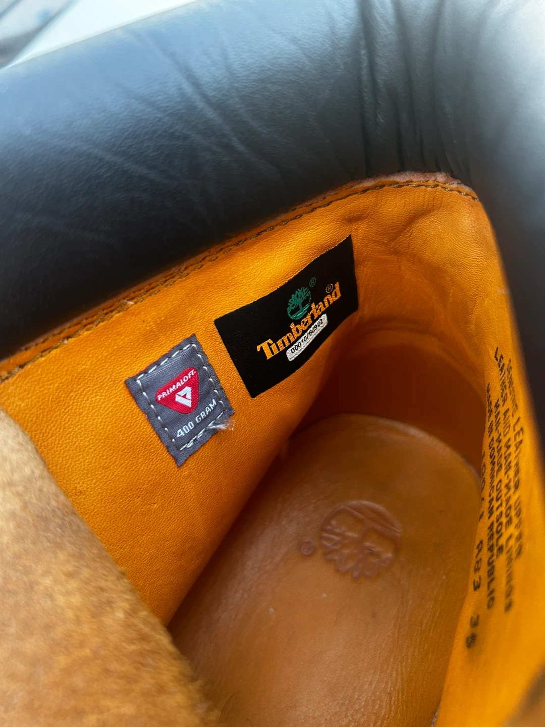 Selling a pair of Timberland boots in size 11M. They have a genuine leather upper and man-made linings. Made in the Dominican Republic.