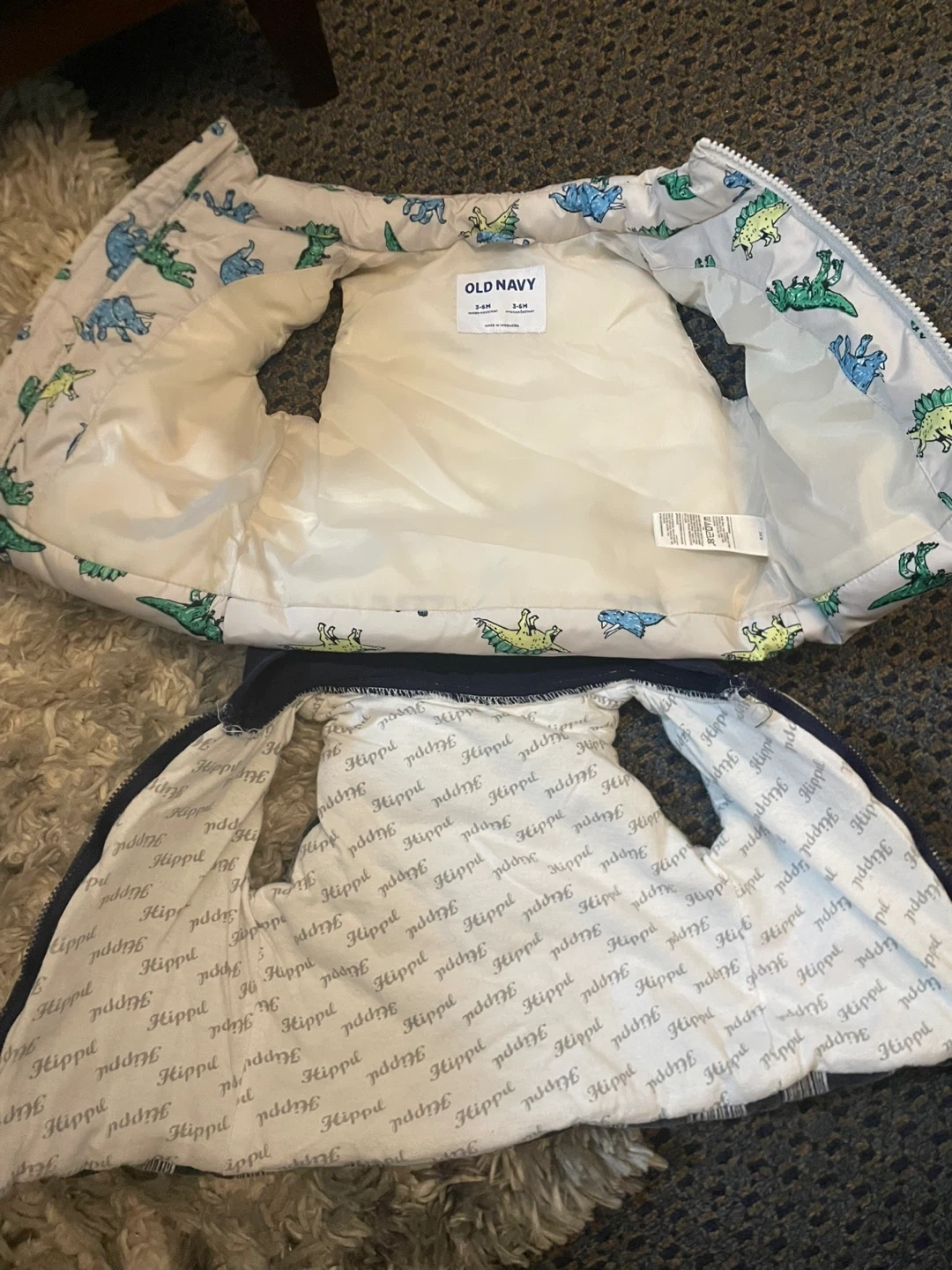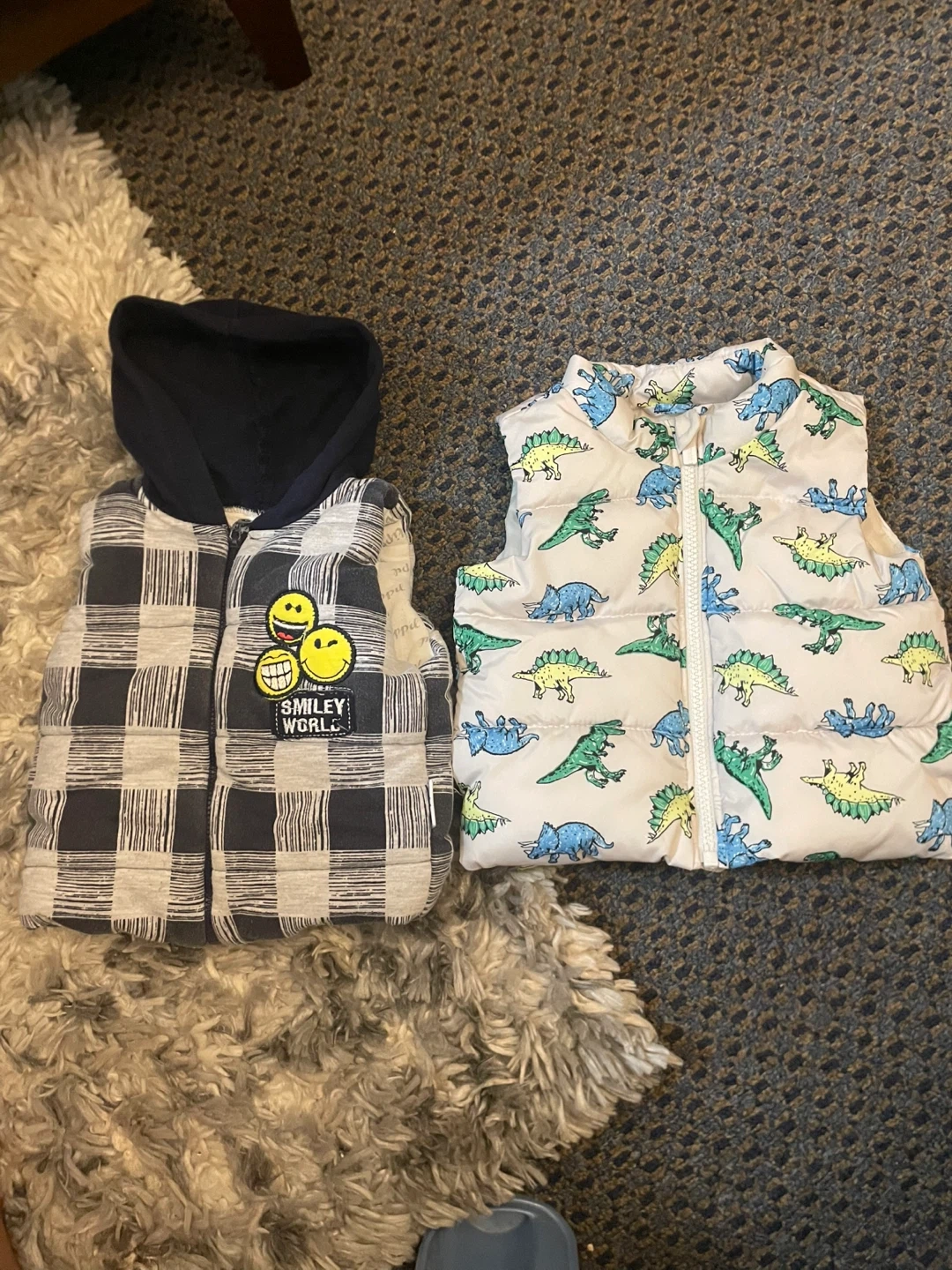 Selling a bundle of two baby vests! One is from Old Navy, both size 3-6M, with a cute dinosaur print. The other has a hood and a fun Smiley World design. Both are in great condition, used a couple of times! Both for 10 dollars, or 5 dollars each!