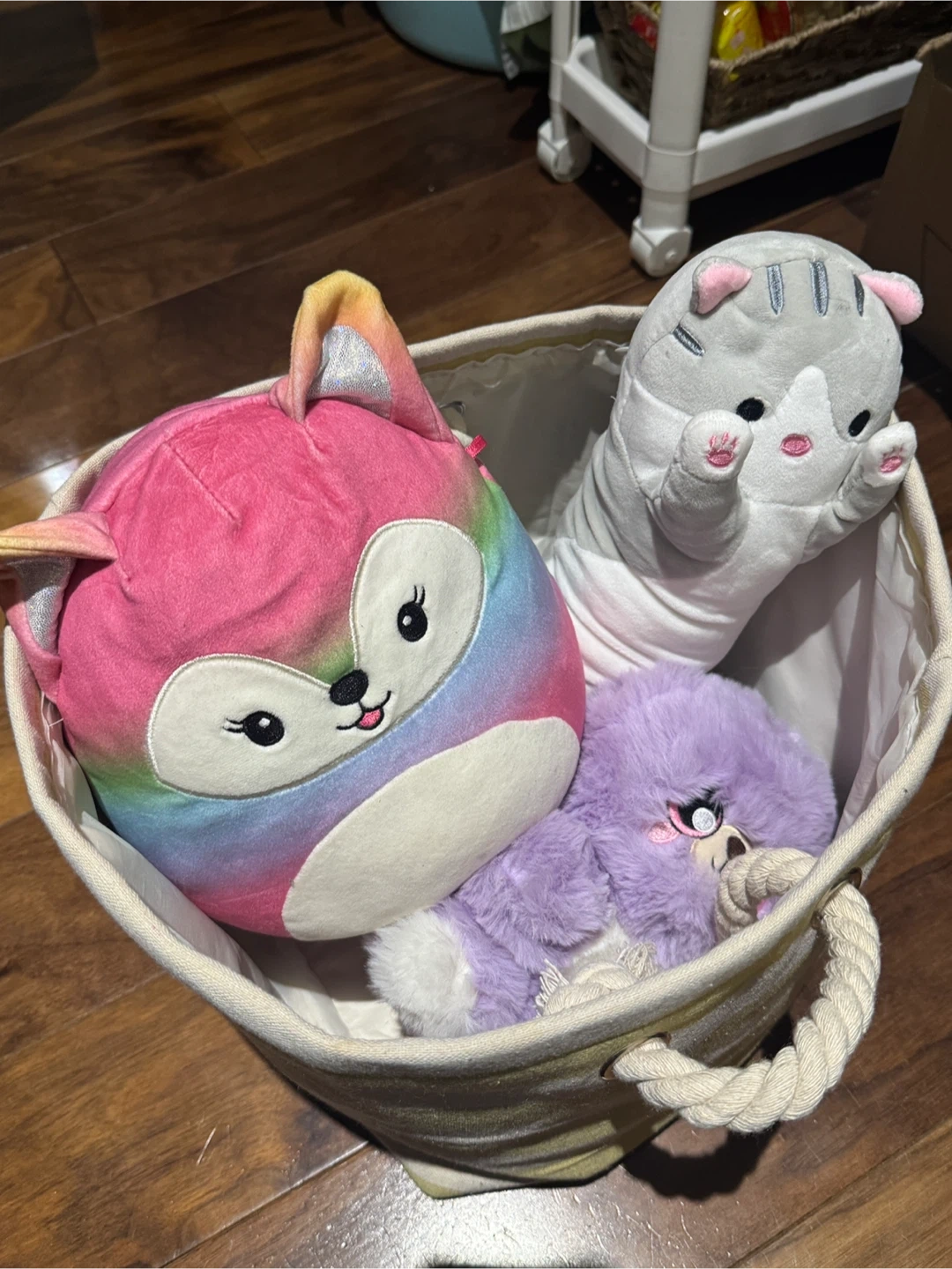 Selling a bundle of adorable plush toys! Includes a Squishmallows fox, a Squeezamals purple bear, and a long grey cat plushie.