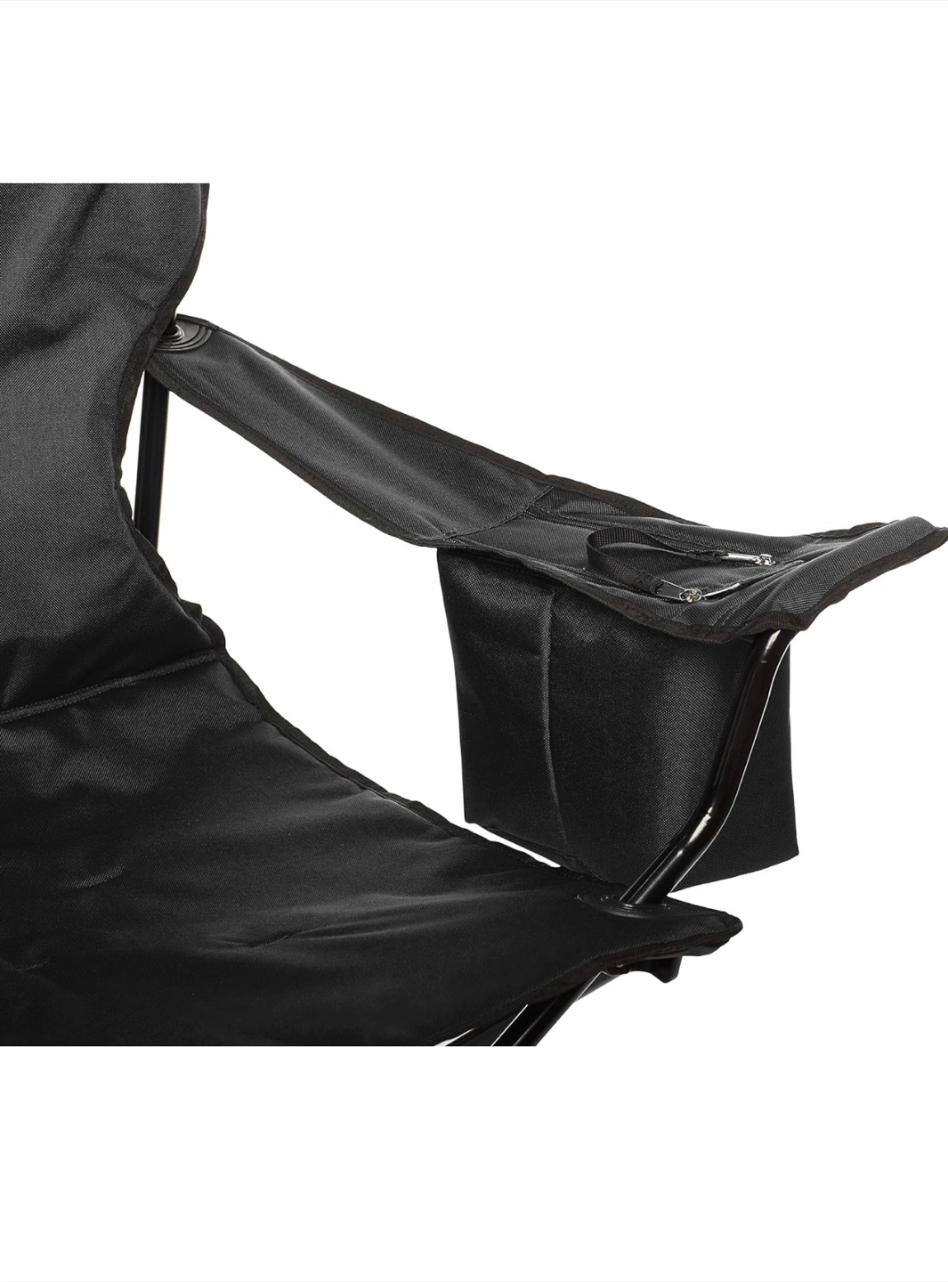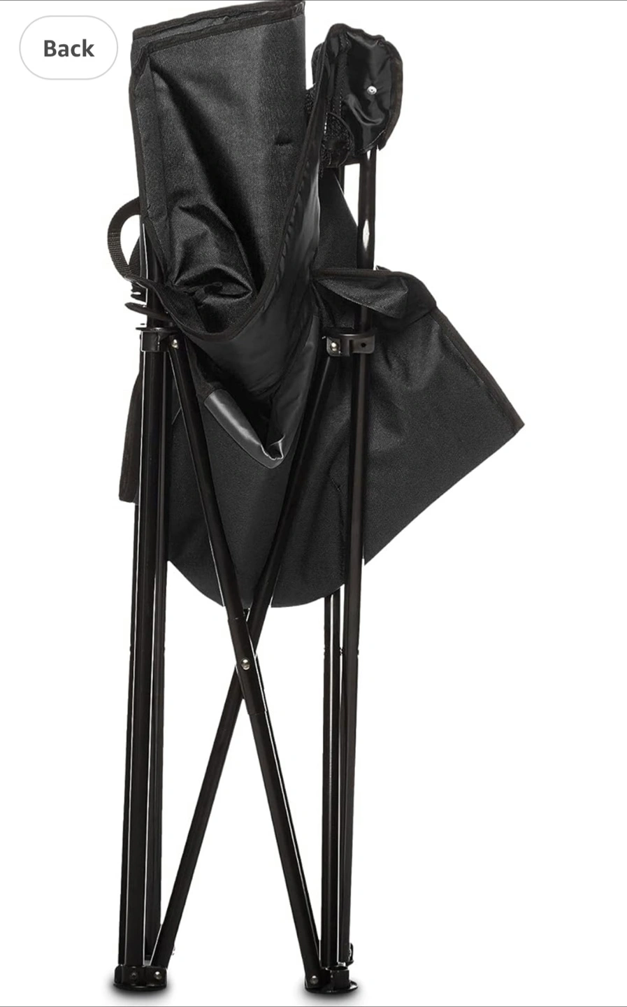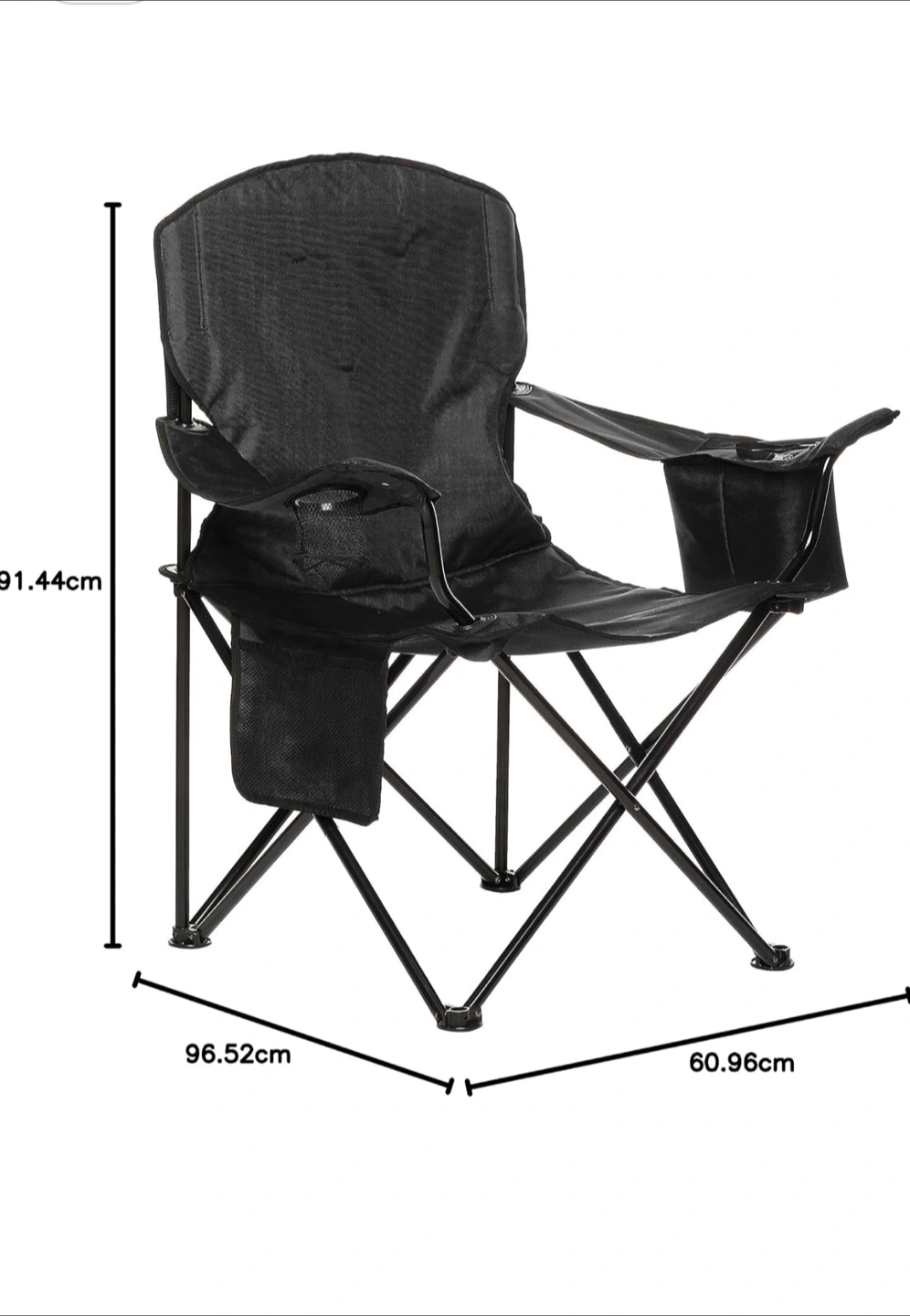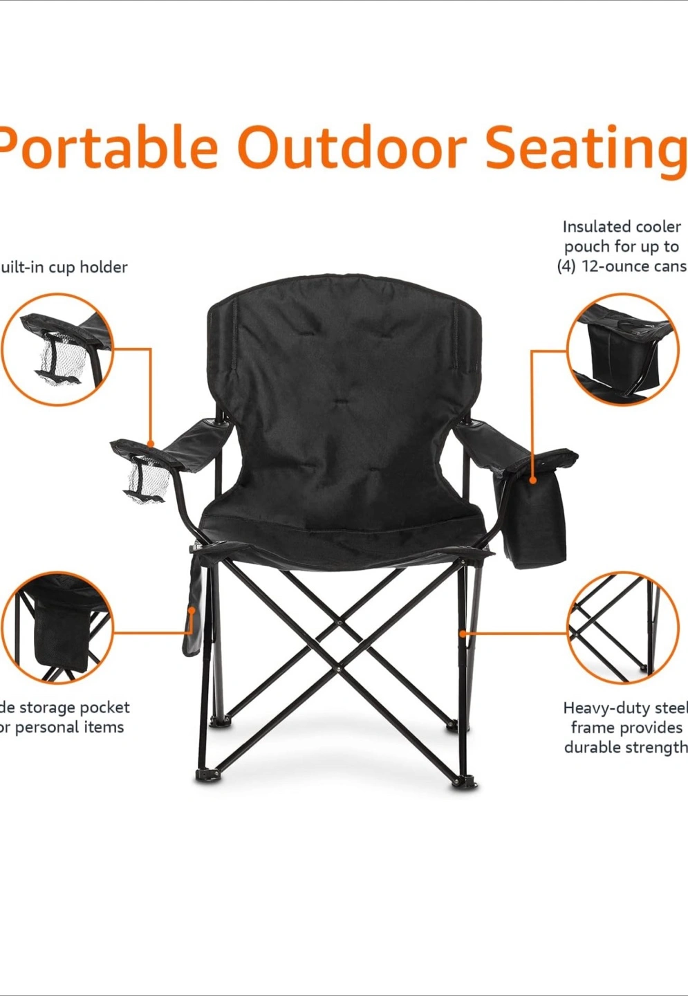 86Get ready for camping season with this portable outdoor folding chair! It's perfect for relaxing by the campfire or enjoying a picnic in the park. 38X24x36 - Includes a built-in cup holder - Insulated cooler pouch for up to (4) 12-ounce cans - Side storage pocket for personal items - Heavy-duty steel frame provides durable strength It's in great condition and comes with a carrying bag for easy transport