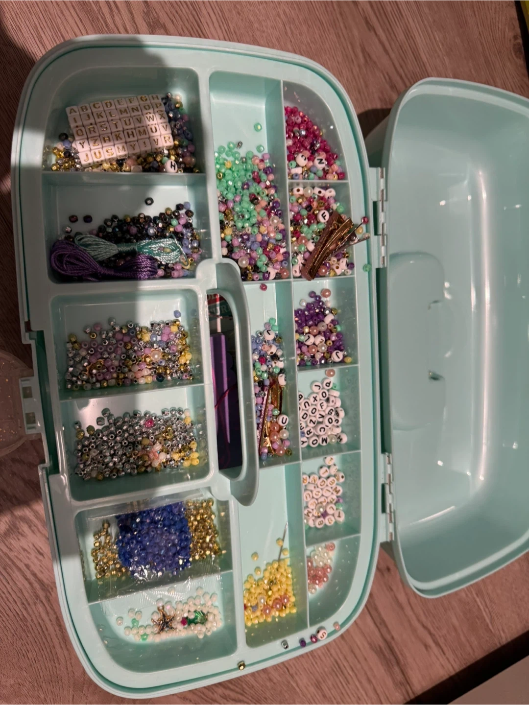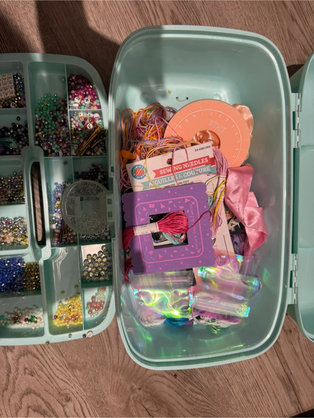 Selling a craft storage container filled with various beads and sewing supplies! It's perfect for anyone who enjoys crafting or is looking to start a new hobby. The container is a light blue/mint colour and has compartments to keep everything organized. There are also sewing needles and embroidery floss included