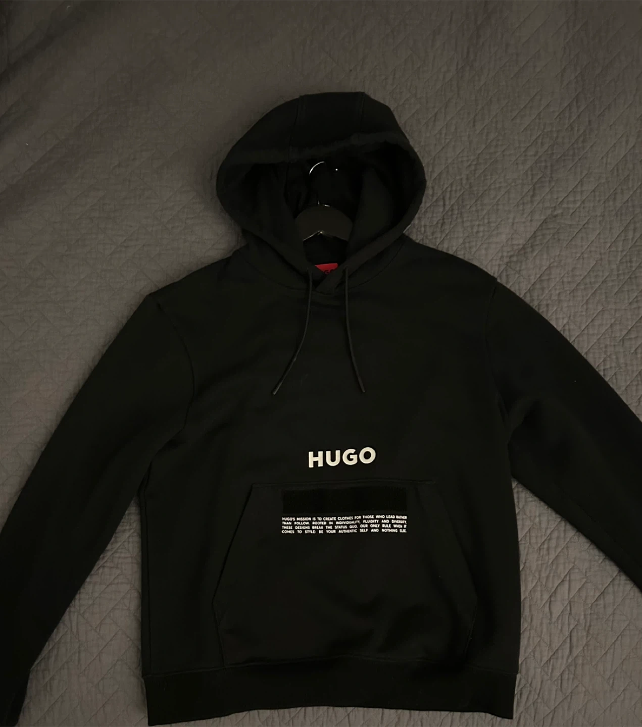 19A classic black HUGO hoodie. The design features the HUGO logo prominently on the front, along with a statement about the brand's mission. A stylish and comfortable piece for everyday wear!