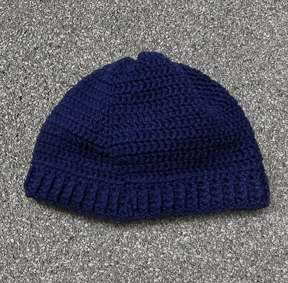 Stay warm and stylish with this cozy, handmade crocheted beanie hat. This unisex hat is crafted with a soft yarn in a classic navy blue color, making it a versatile accessory for any cold-weather outfit. The design features a textured stitch pattern on the main body and a stretchy ribbed band at the bottom for a comfortable and secure fit.