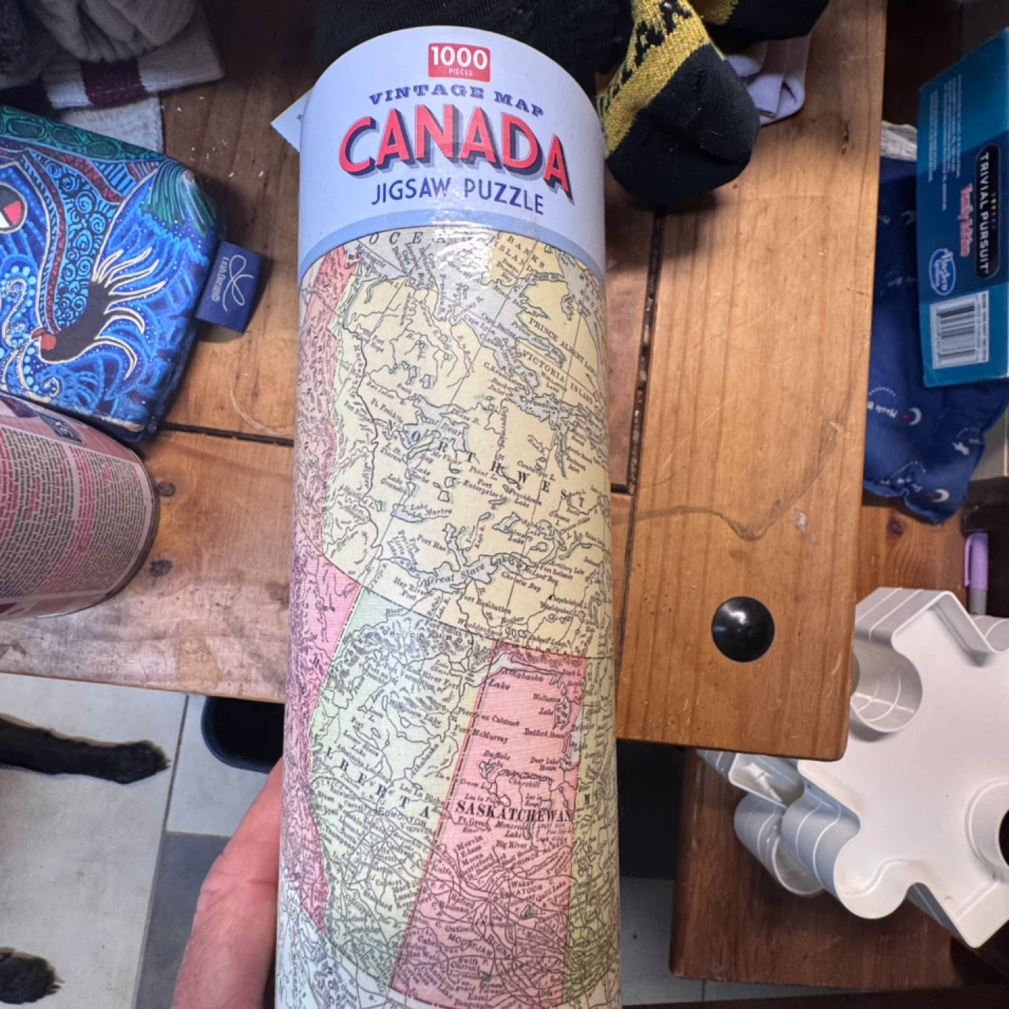 Selling a 1000-piece vintage map jigsaw puzzle of Canada. It features a beautiful map design and is perfect for puzzle enthusiasts and geography lovers alike. The puzzle comes in a unique tube-shaped box with a vintage aesthetic. It's a great way to spend time and learn about Canadian geography