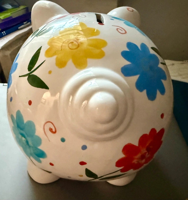 This is a charming floral ceramic piggy bank, perfect for adding a touch of whimsy to any room while saving your spare change. It's in good used condition and ready for a new home. This piggy bank features delightful hand-painted floral designs in various colours. I've taken good care of this piggy bank, and it's looking for a new home to continue its savings journey. If you're seeing this ad, the piggy bank is still available. It's just waiting to be whisked away to its new home!