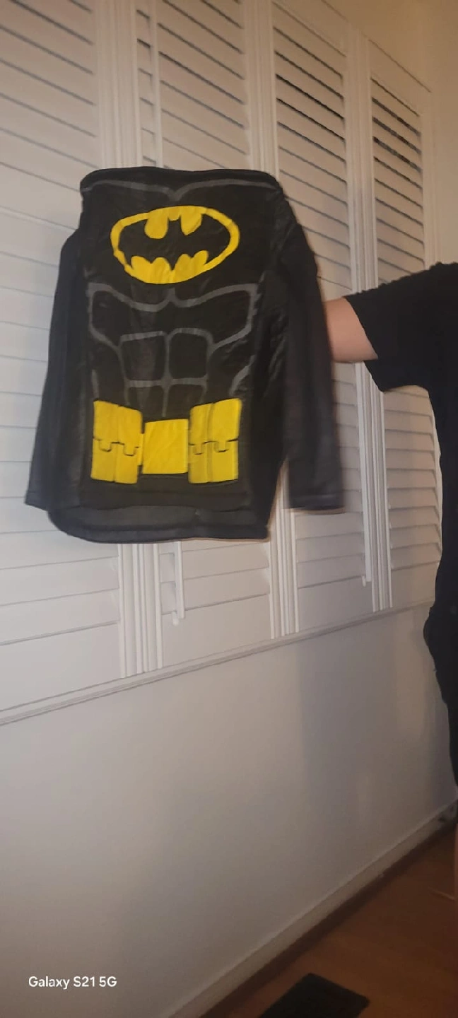 Selling a Batman costume. The size isn't marked, so please check the photos to see if it's the right fit for your little superhero
