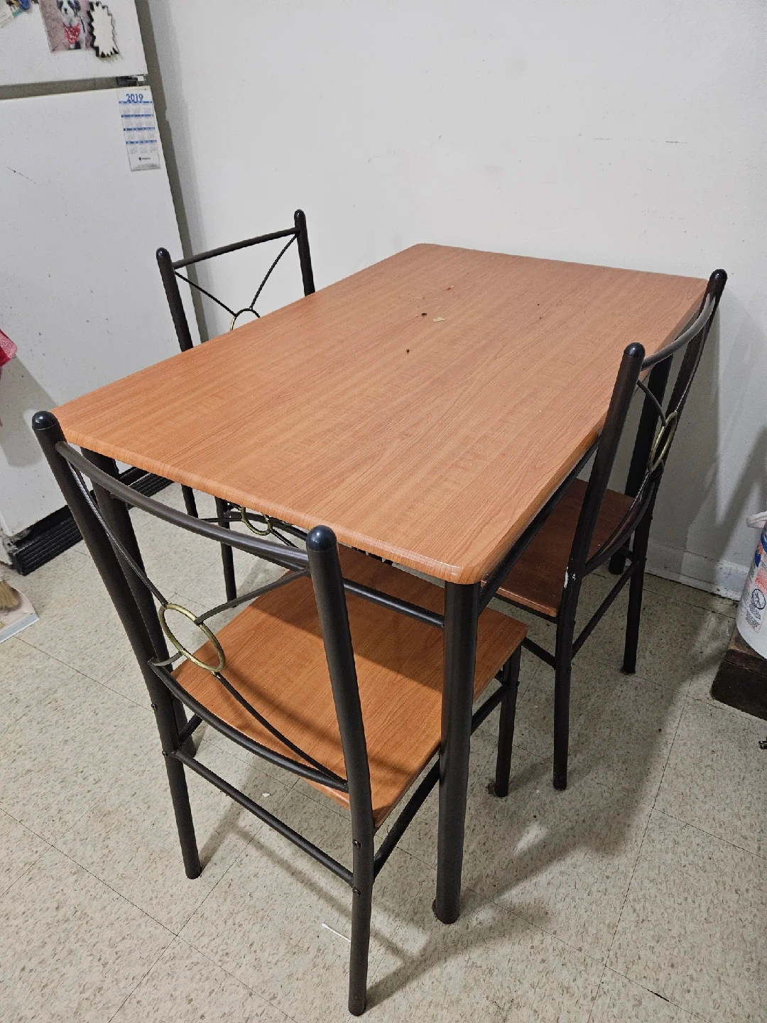 Here's a dining table set that includes the table and four chairs. It features a wood-look top and seats with a black metal frame. It's a great set for a small space!
