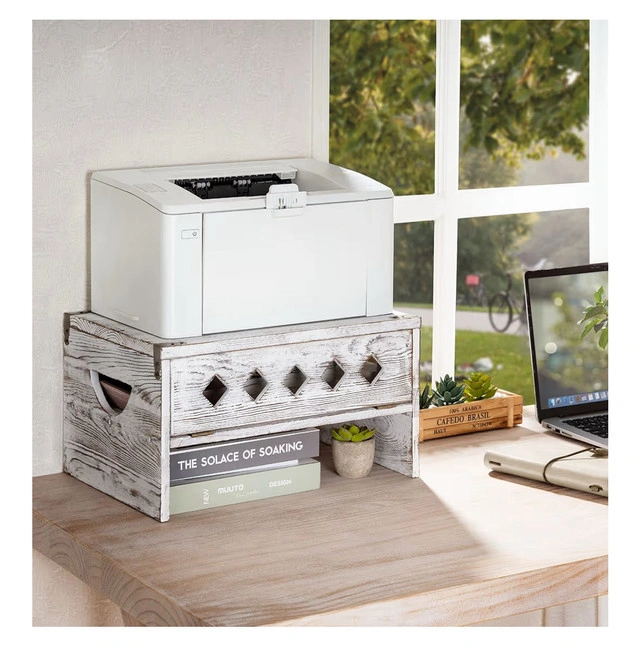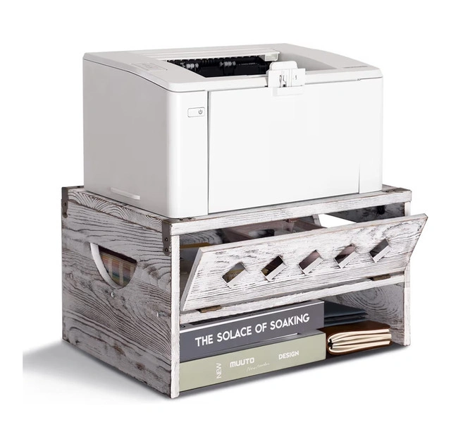 1000+This new printer stand offers a stylish and functional solution for organizing your workspace, featuring a rustic white-washed wood finish, a convenient storage shelf, and durable steel corner brackets. The stand measures approximately 40cm wide x 30cm deep x 21.5cm high, providing ample space for most printers and additional office supplies. Specifications: * Material: Natural pine wood with steel brackets * Finish: Rustic white-washed * Features: Storage shelf with unique hollow-carved design, side handles for easy movement * Dimensions: 40cm (width) x 30cm (depth) x 21.5cm (height) Spruce up your office with this charming printer stand, it's still sturdy and ready to keep your printer in place. YOU NEED TO ASSEMBLE IT. Of course, if you're reading this, it's still available!