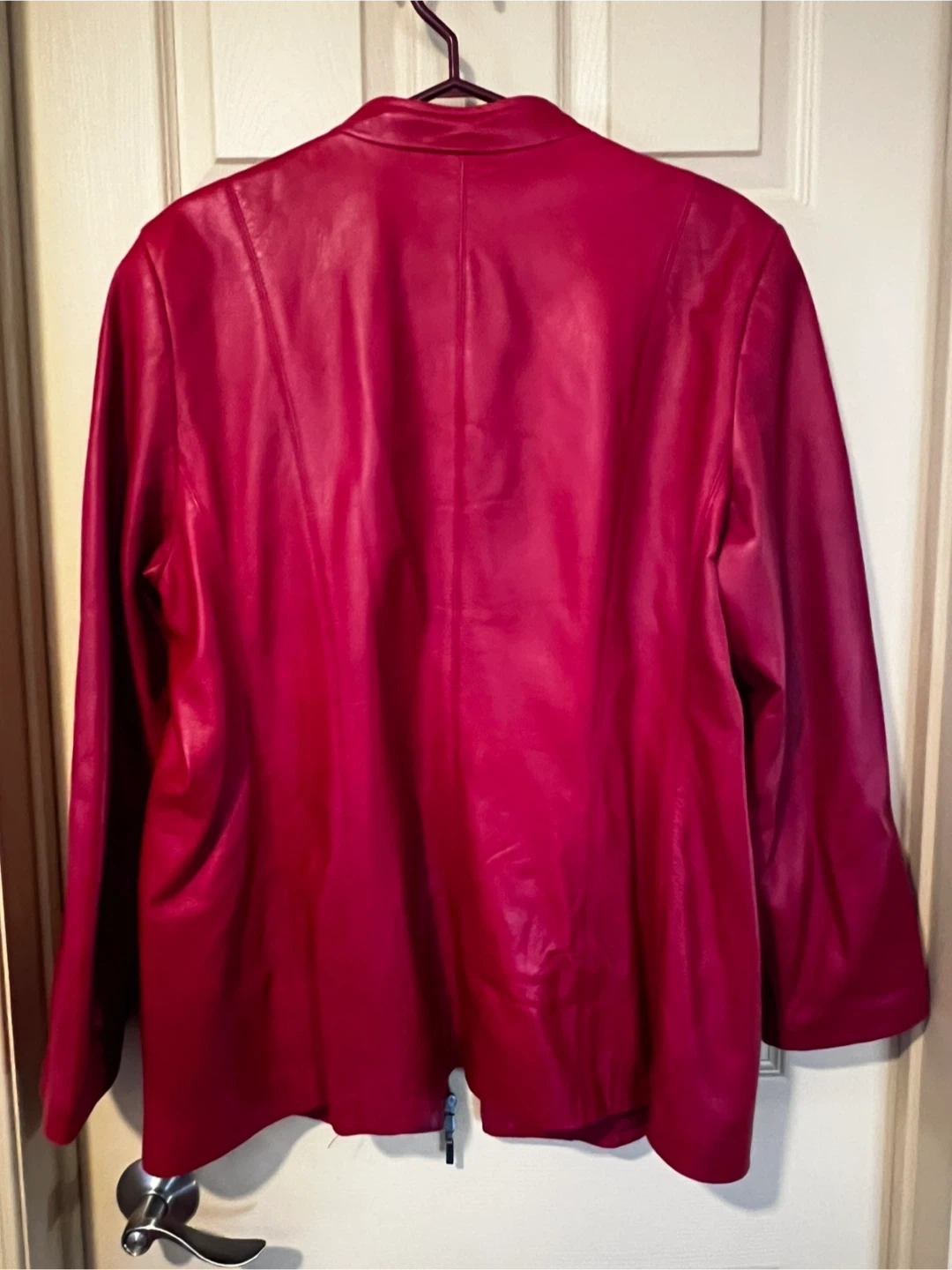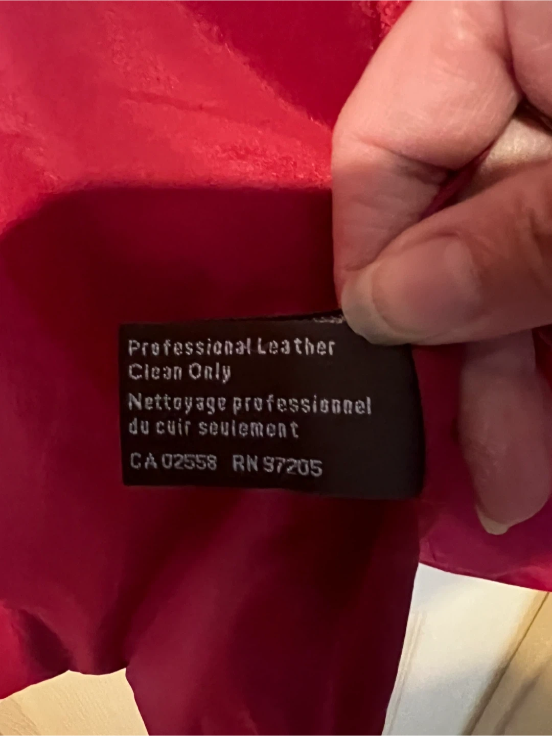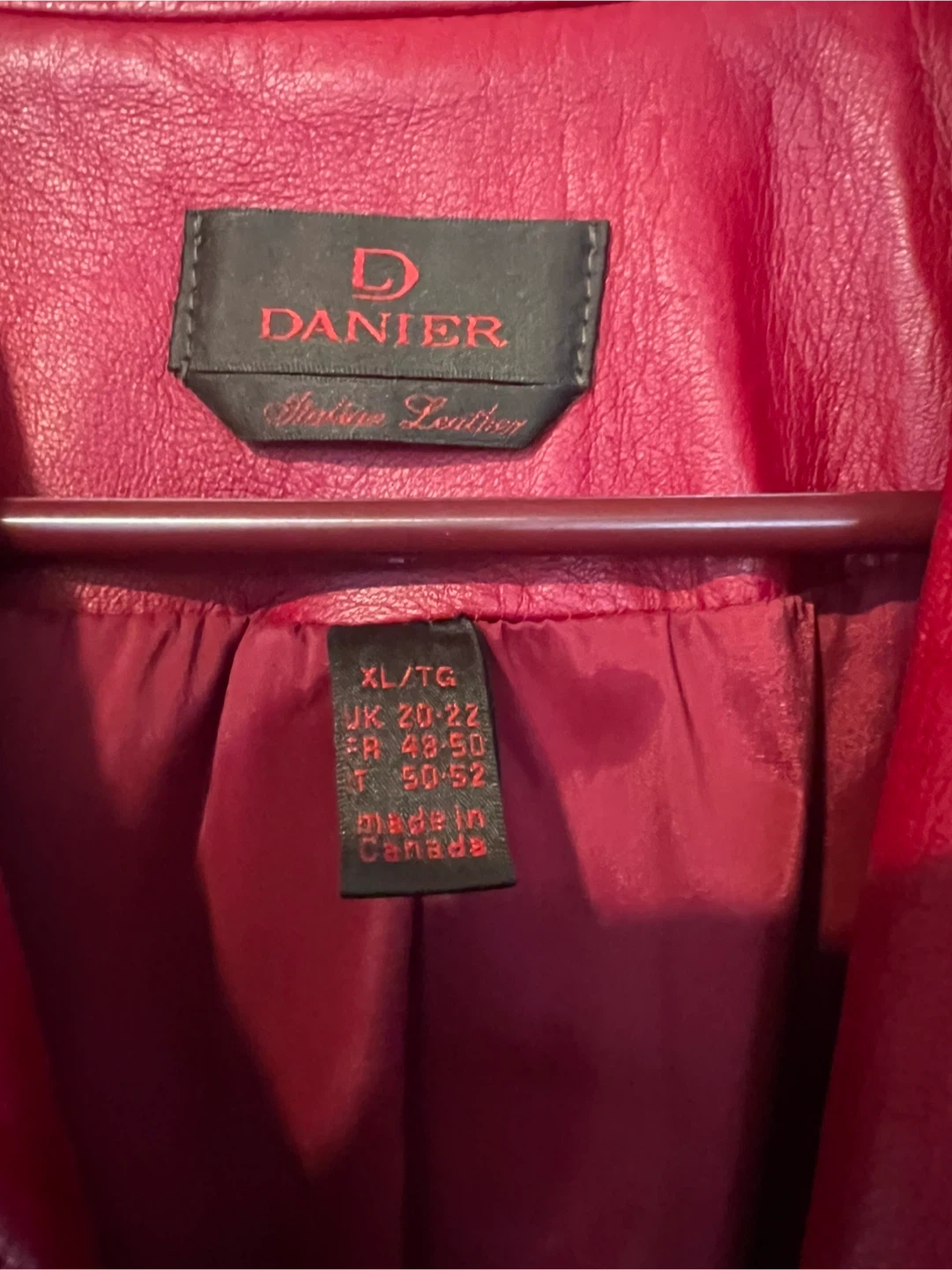 10Selling a Ladies Danier leather jacket in excellent condition! It's a vibrant red colour and size XL. The tag indicates it's made in Canada. It's recommended to have it professionally leather cleaned to keep it looking its best