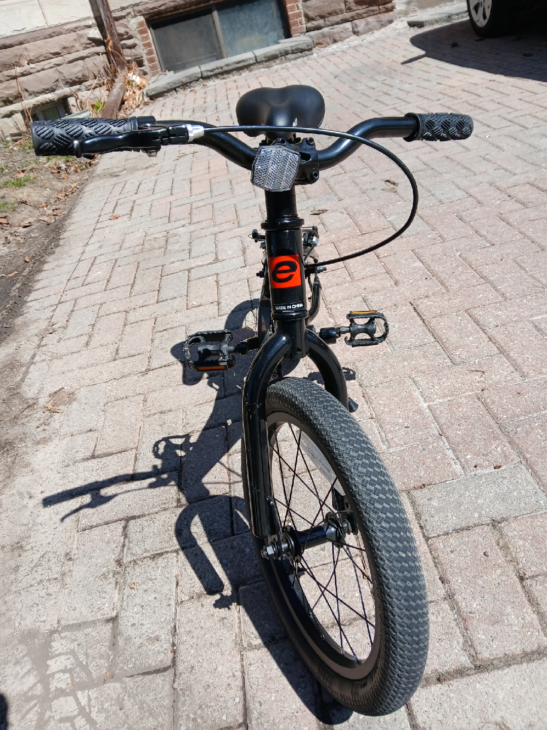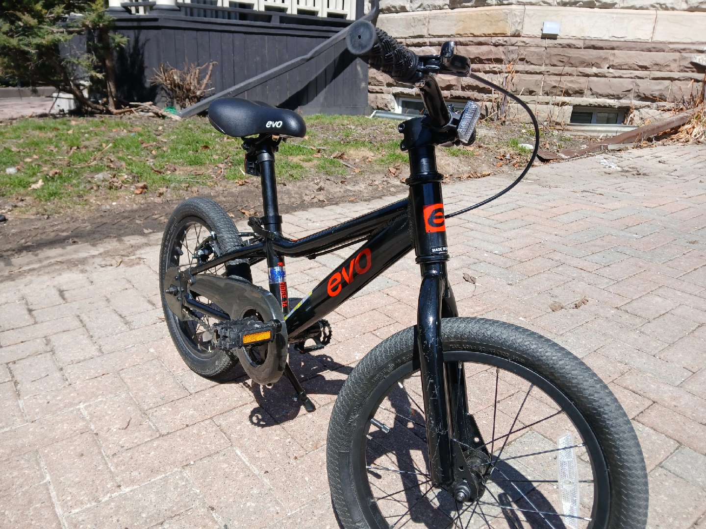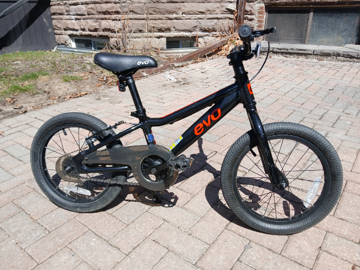 Selling a used EVO 16 inch kids bike in black and red. It's in good condition and ready for a new rider! Perfect for kids learning to ride or upgrading to a bigger size.