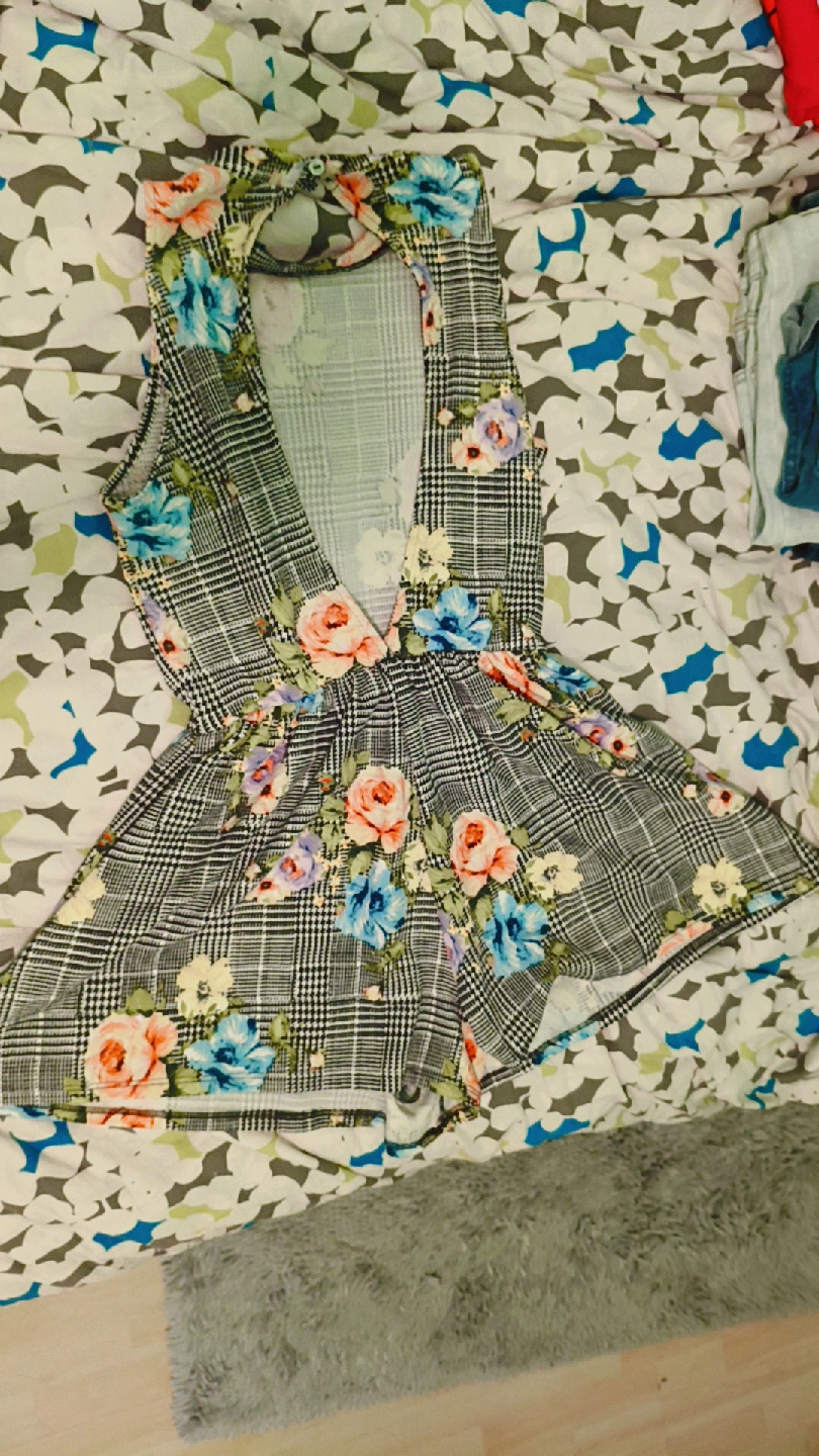 Cute romper featuring a black and white plaid pattern with a colourful floral design. It's in great condition and perfect for spring or summer!
