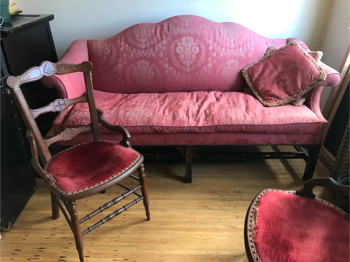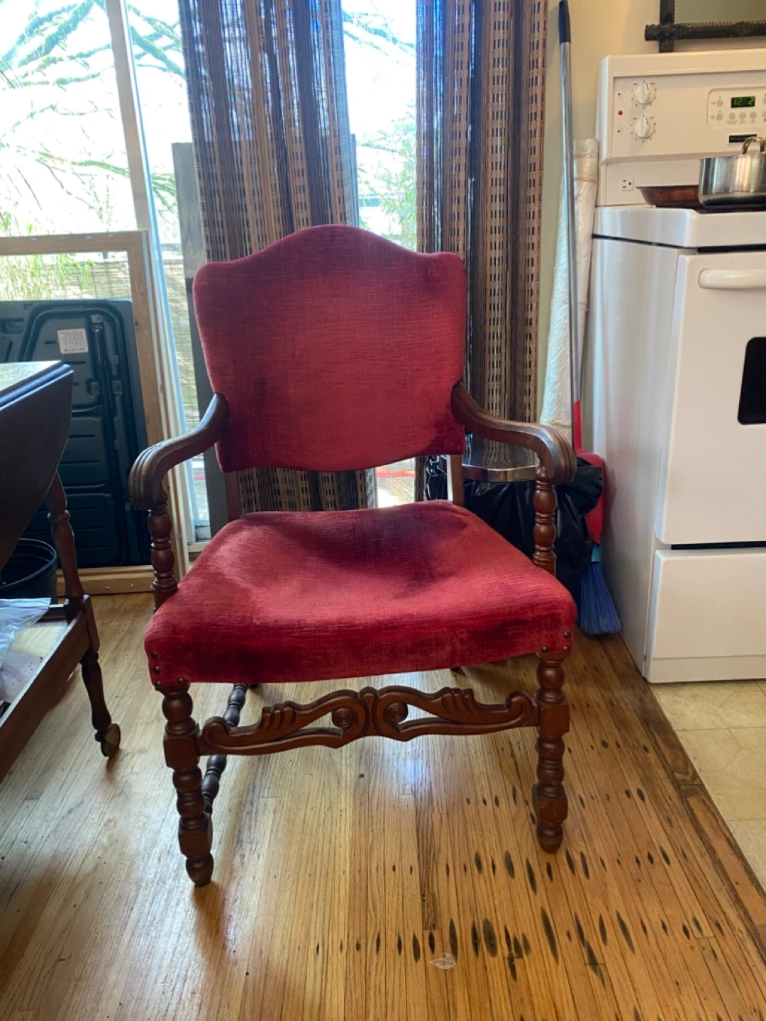 -Antique red velvet chairs that my grampa got from Bishop Pinkham’s estate in Alberta. They also need to be recovered and refinished.
