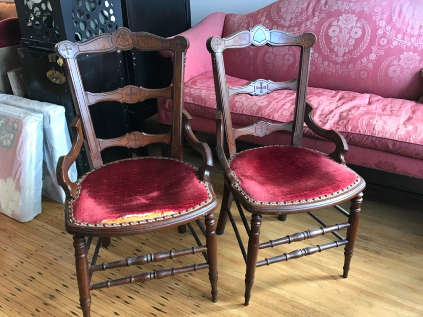 -Antique red velvet chairs that my grampa got from Bishop Pinkham’s estate in Alberta. They also need to be recovered and refinished.