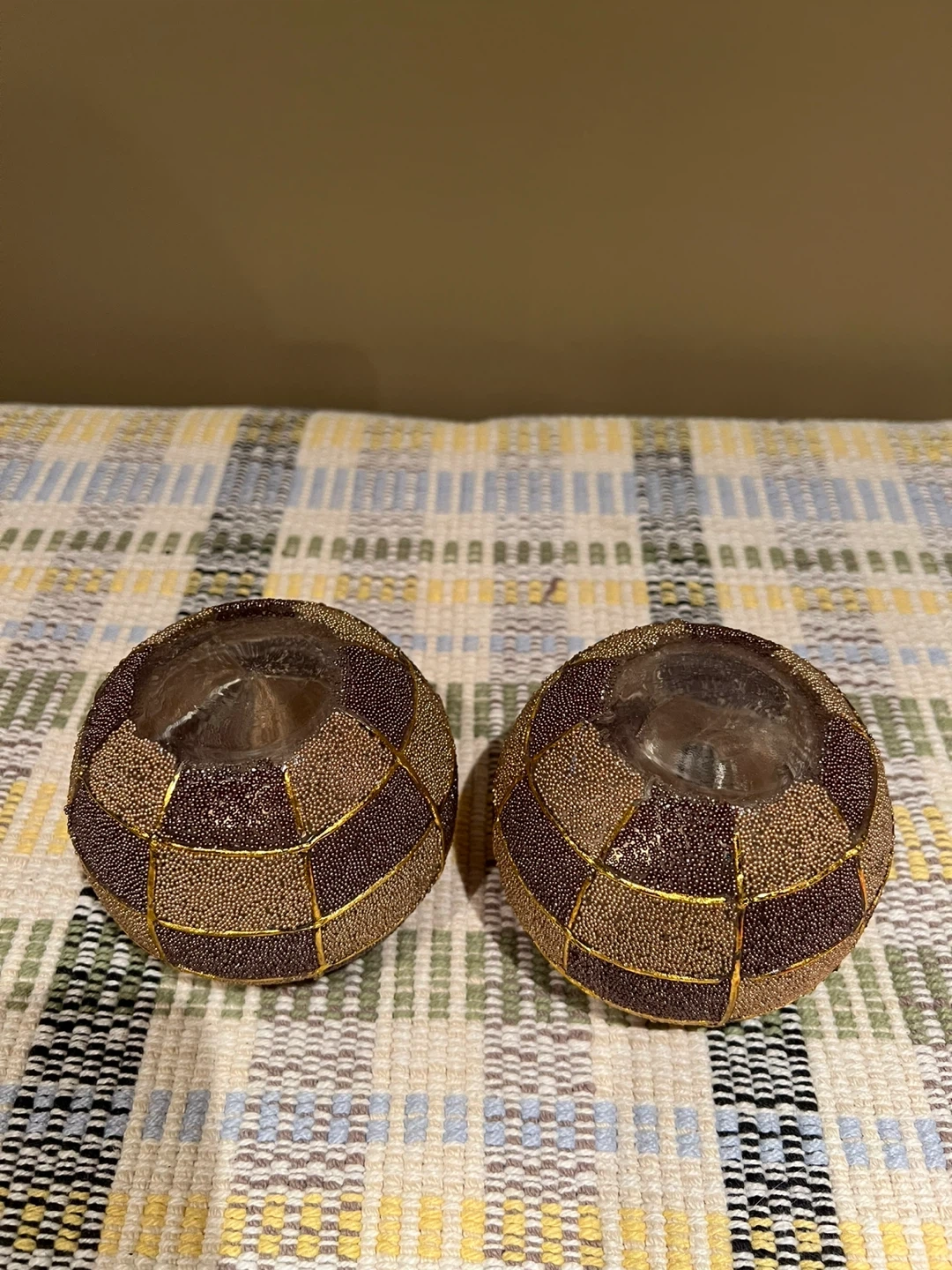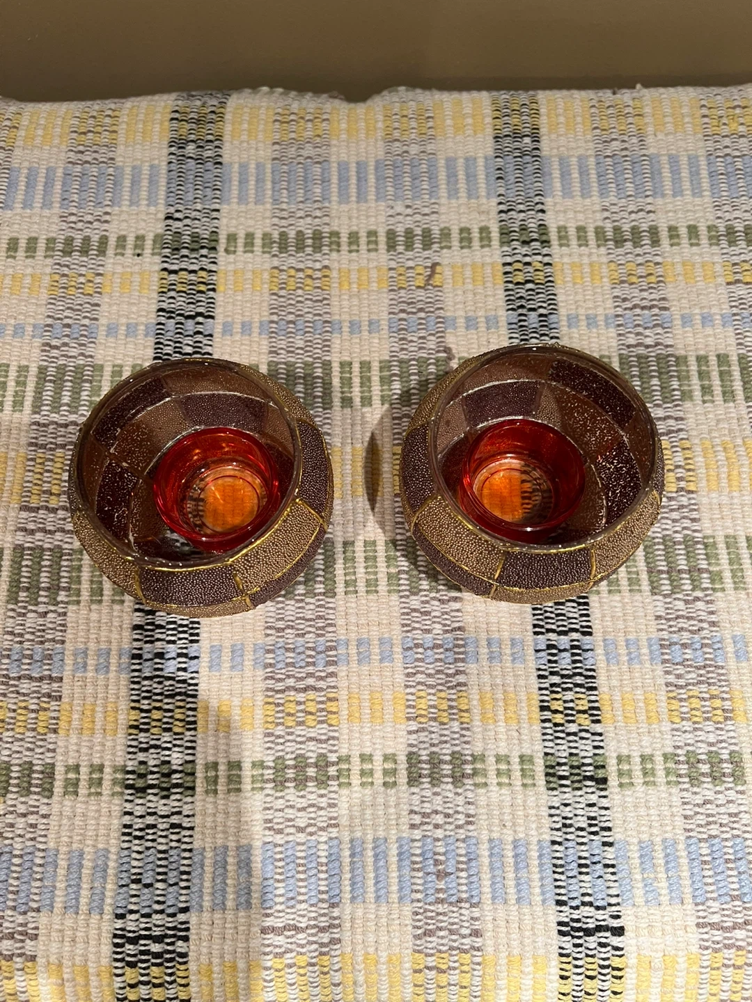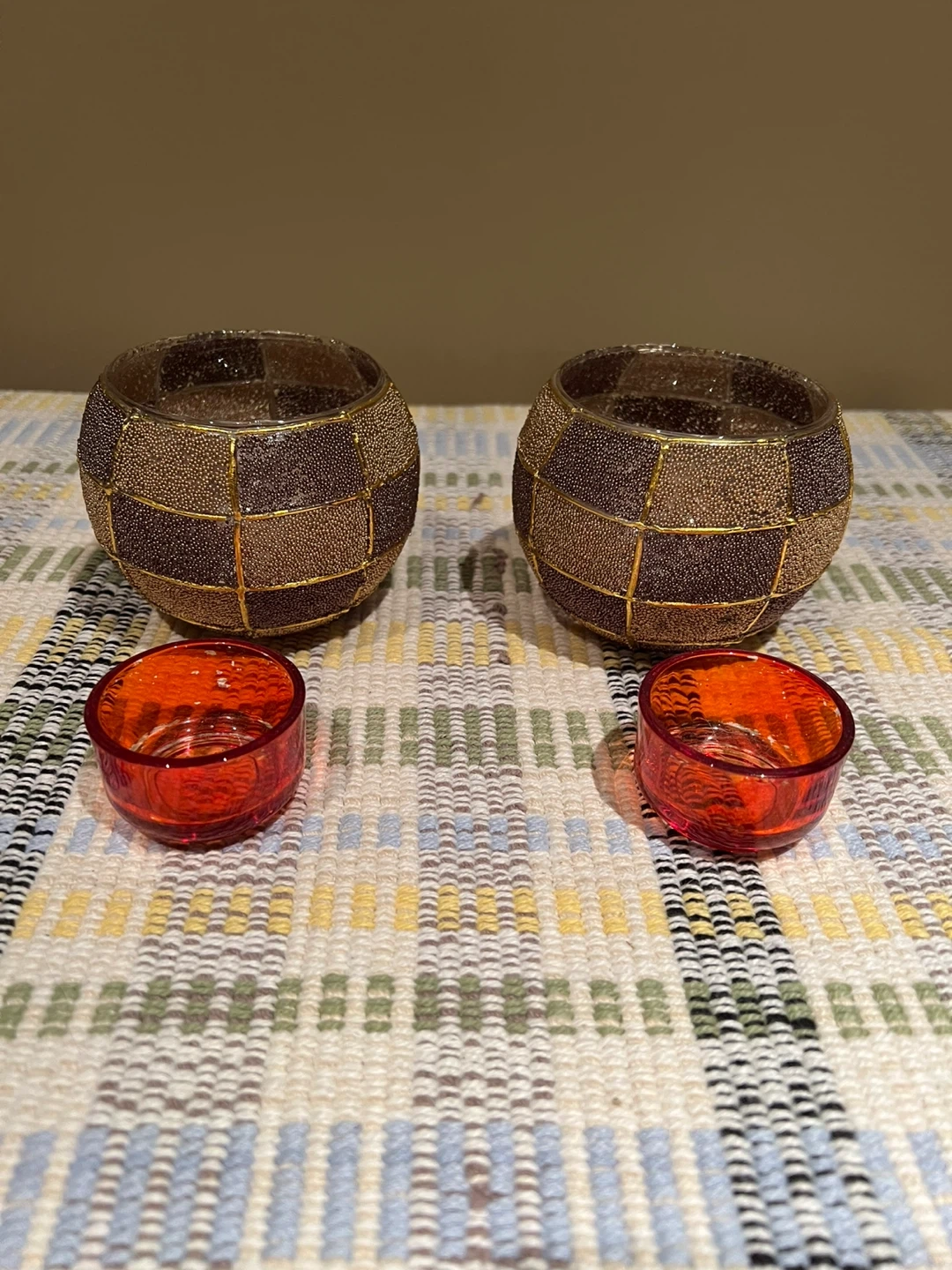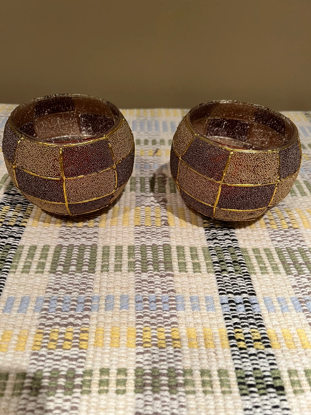 178Selling a set of two decorative candle holders! They feature a unique checkered pattern with gold accents and a glass interior. Perfect for adding a touch of warmth to any room