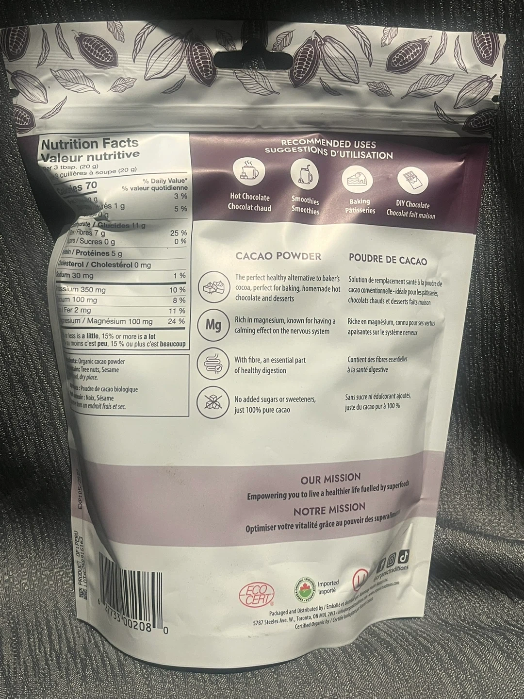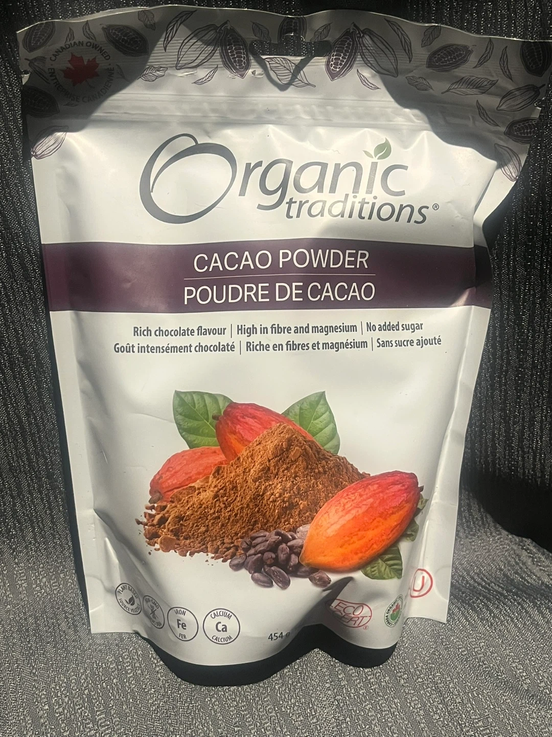 1000+Selling a bag of Organic Traditions Cacao Powder! It's perfect for baking, hot chocolate, smoothies, and other desserts. It's rich in magnesium and high in fibre, with no added sugars or sweeteners. It's also 100% pure cacao. Expiry date is May 2027