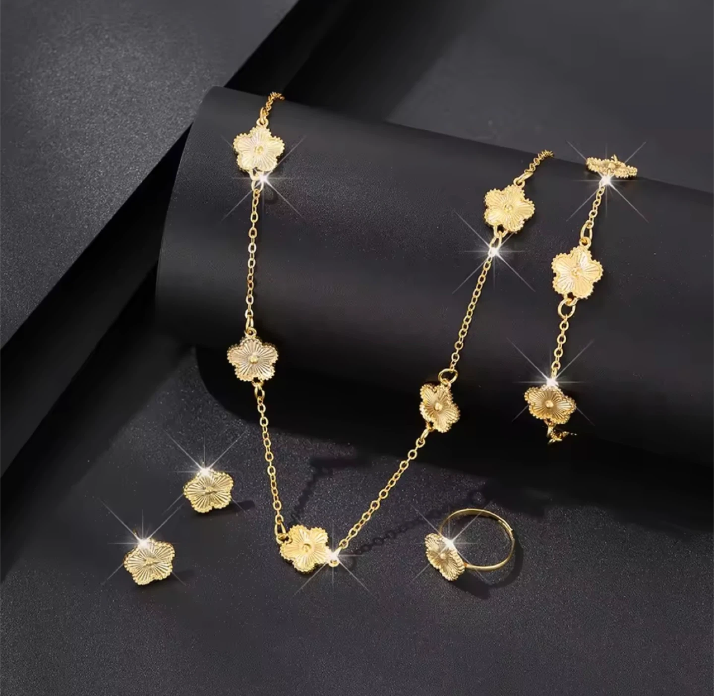 10Selling a beautiful gold-tone jewellery set featuring a floral design! Includes a necklace, bracelet, ring, and a pair of earrings. Perfect for adding a touch of elegance to any outfit