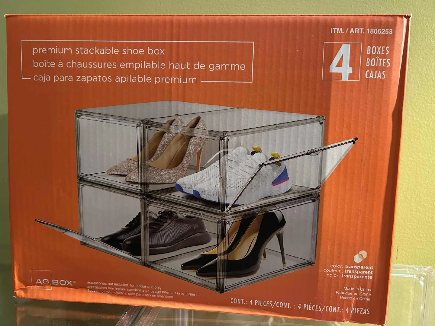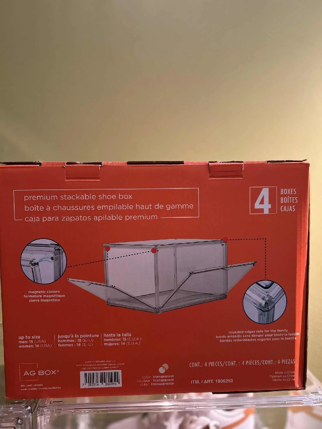 Keep your shoes organized with this AG BOX premium stackable shoe box. It comes with 4 transparent boxes for easy viewing. The boxes feature a magnetic closure and rounded edges for safety. Made in China.