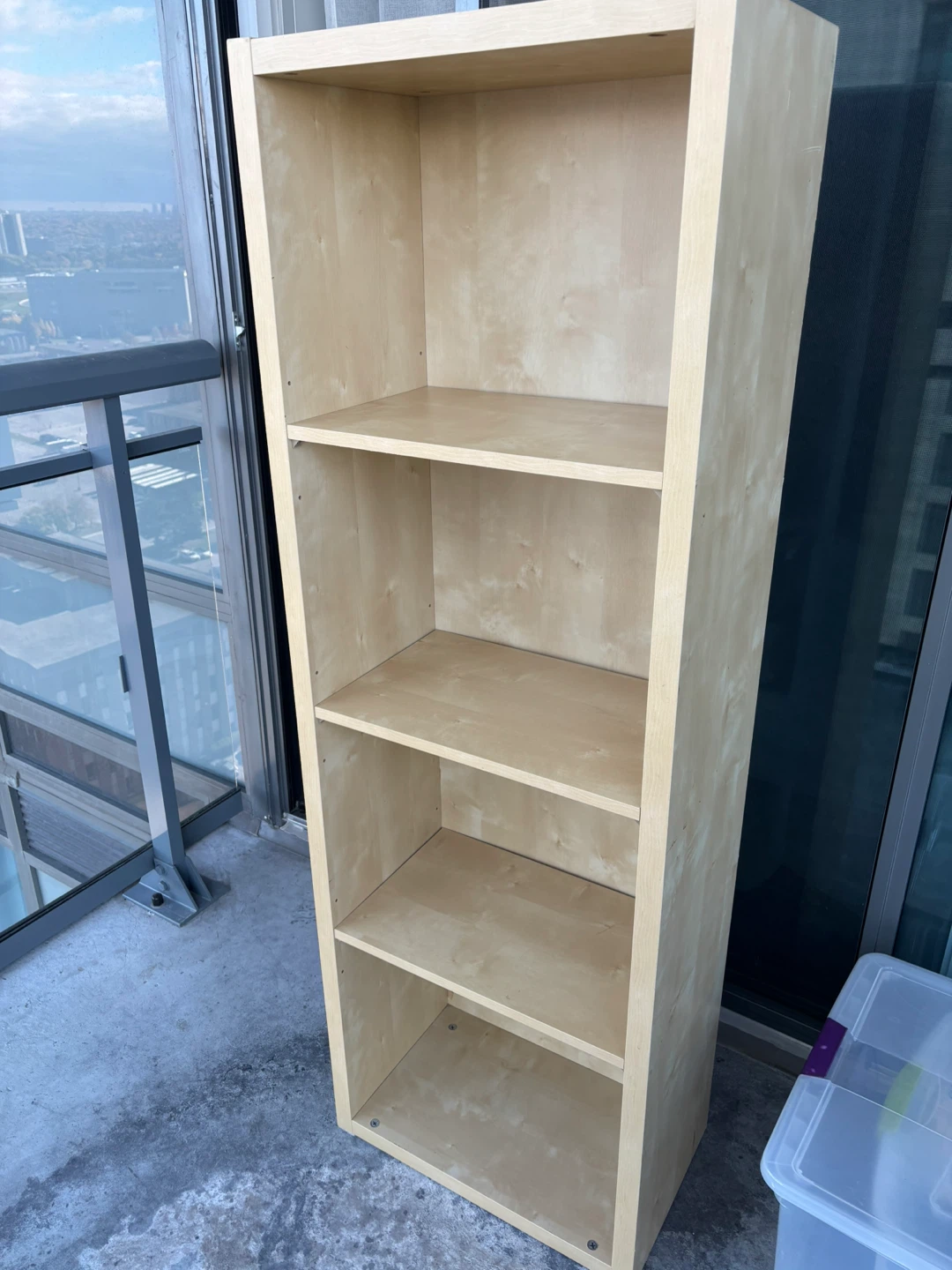 Selling a light wood bookshelf! It measures approximately 59 inches tall, 19 inches wide, and 11 inches deep. It's in excellent condition and ready for a new home