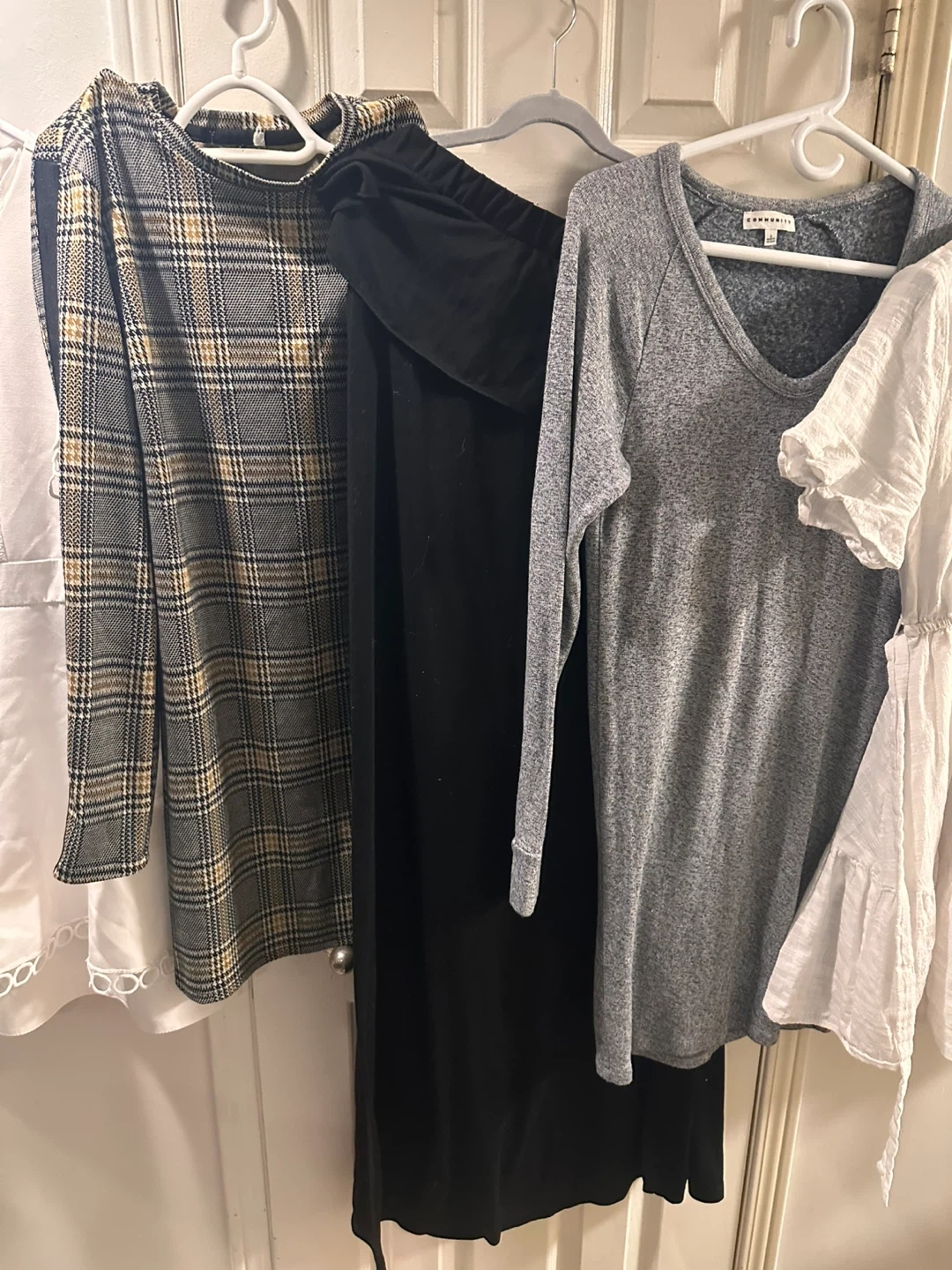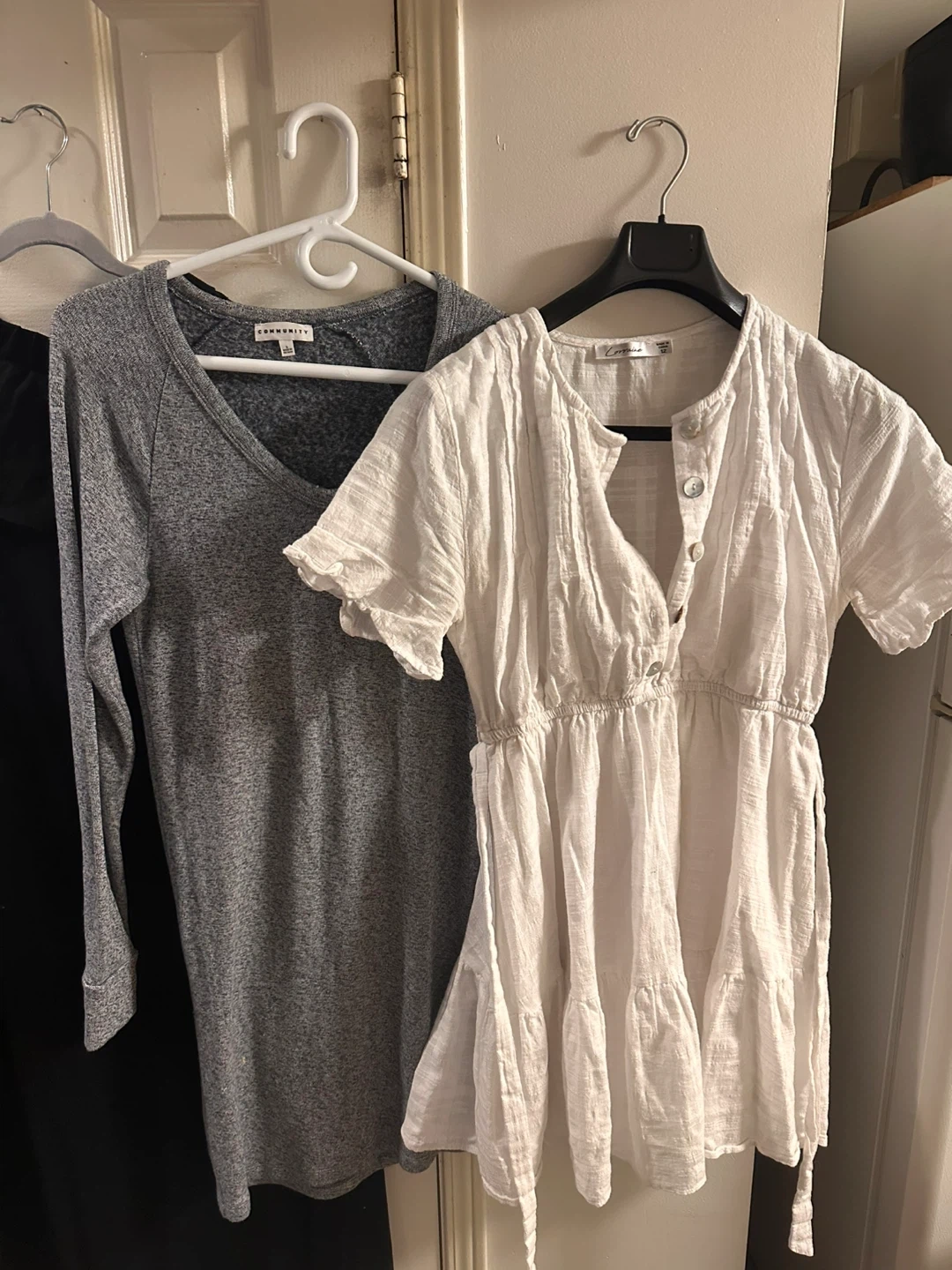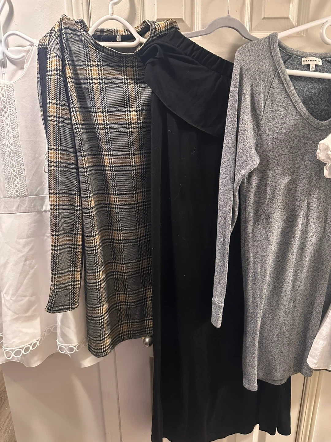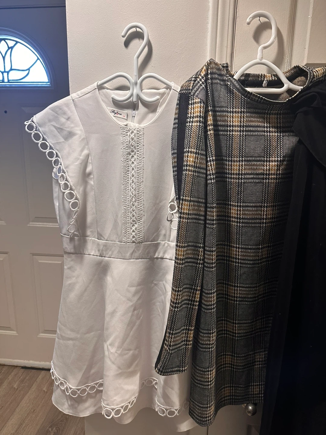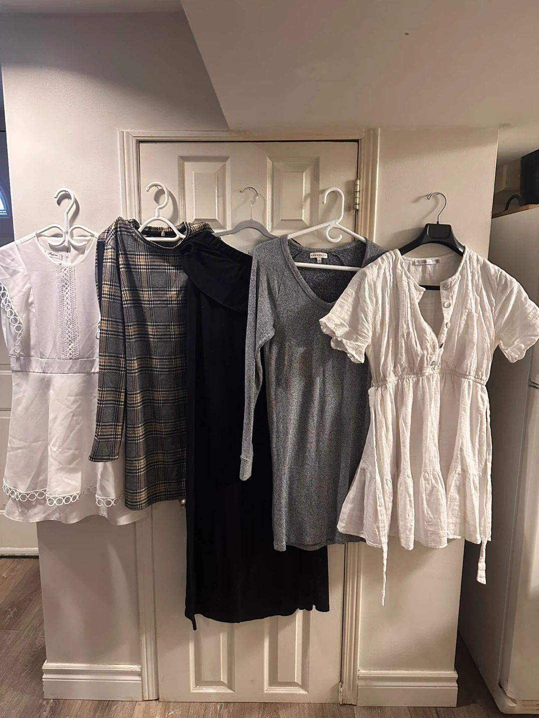 541Selling a bundle of dresses, all in good condition and ready for a new home! Includes a white dress with lace detailing, a plaid long-sleeve dress, a black dress, a grey dress, and a white button-up dress