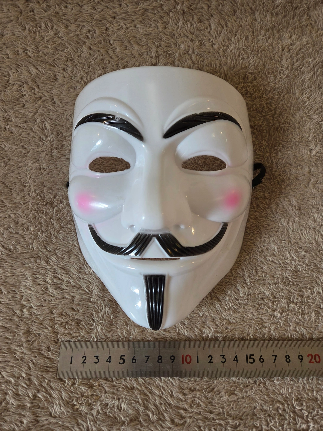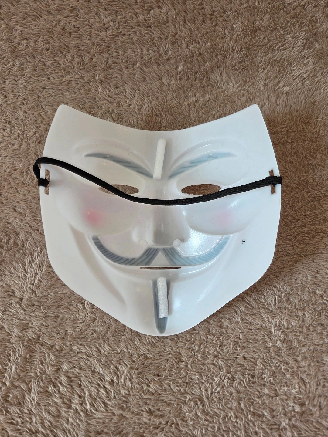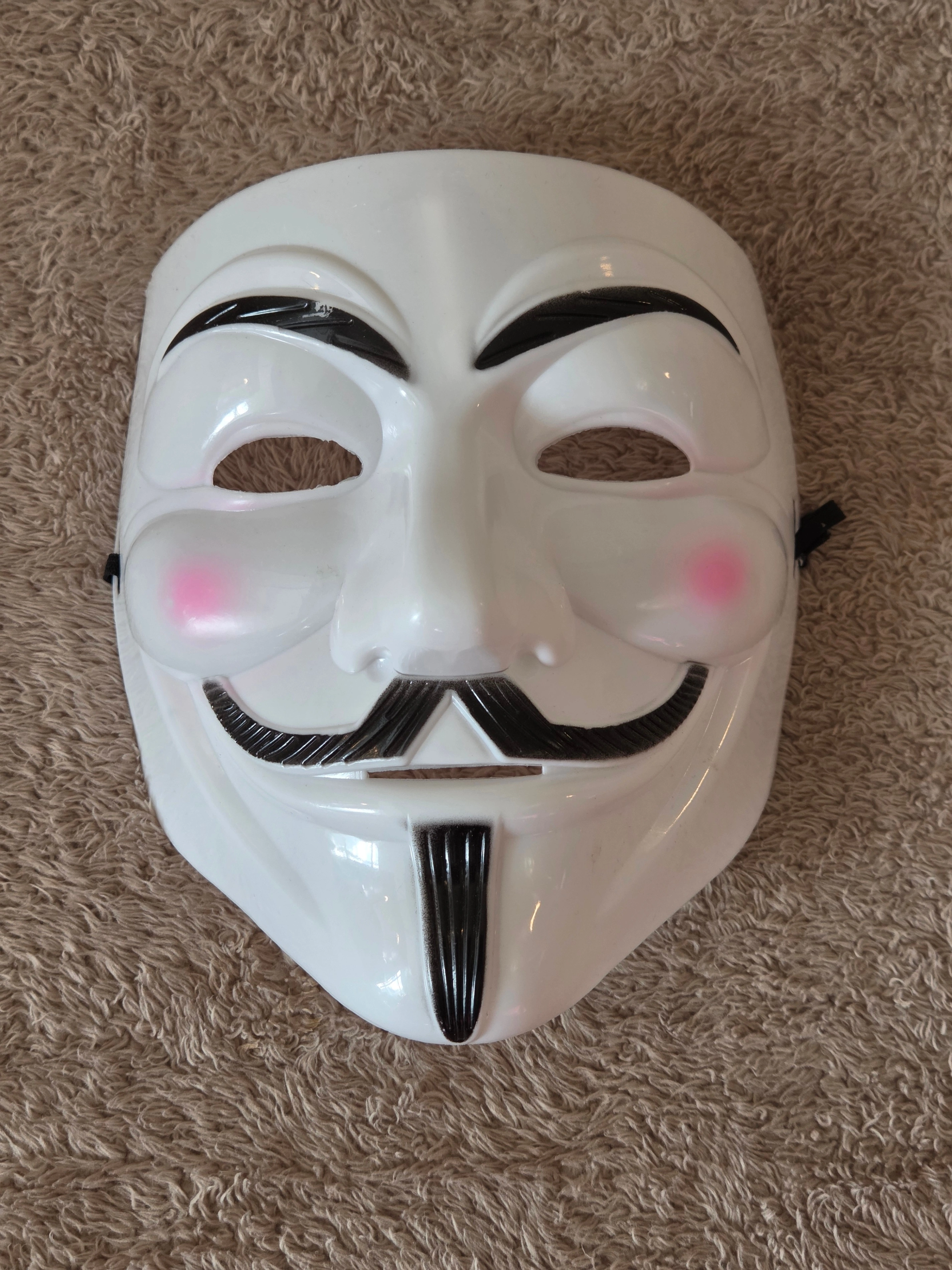 – Key specs: white plastic Guy Fawkes style face mask, black brows and moustache, pink cheeks, elastic head strap, foam pad on the nose, adult size, open eye and mouth slots for easy breathing and visibility.