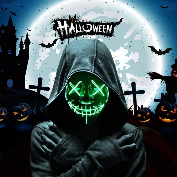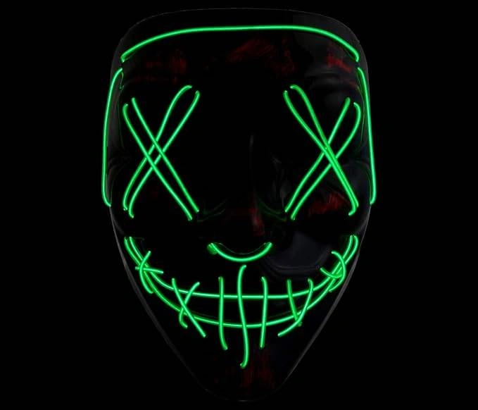 Fun glowing mask for Christmas parties, New Year’s Eve and masquerade nights. Bright neon green lines cross the eyes and smile – looks awesome in the dark and on photos. Great for adults or teens with a hoodie or full costume.
