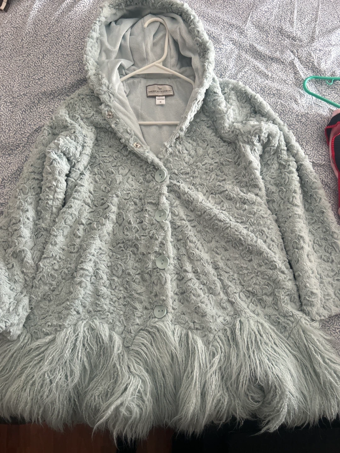 Here's a cozy American Widgeon hooded coat in size M! It features a unique faux fur texture and a button-up front. Perfect for adding a touch of style and warmth to your wardrobe