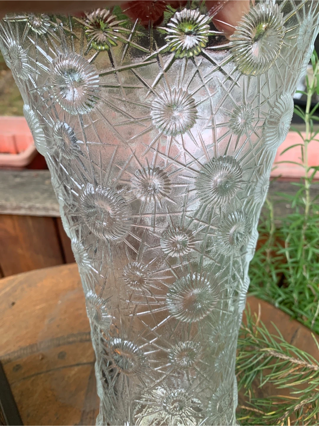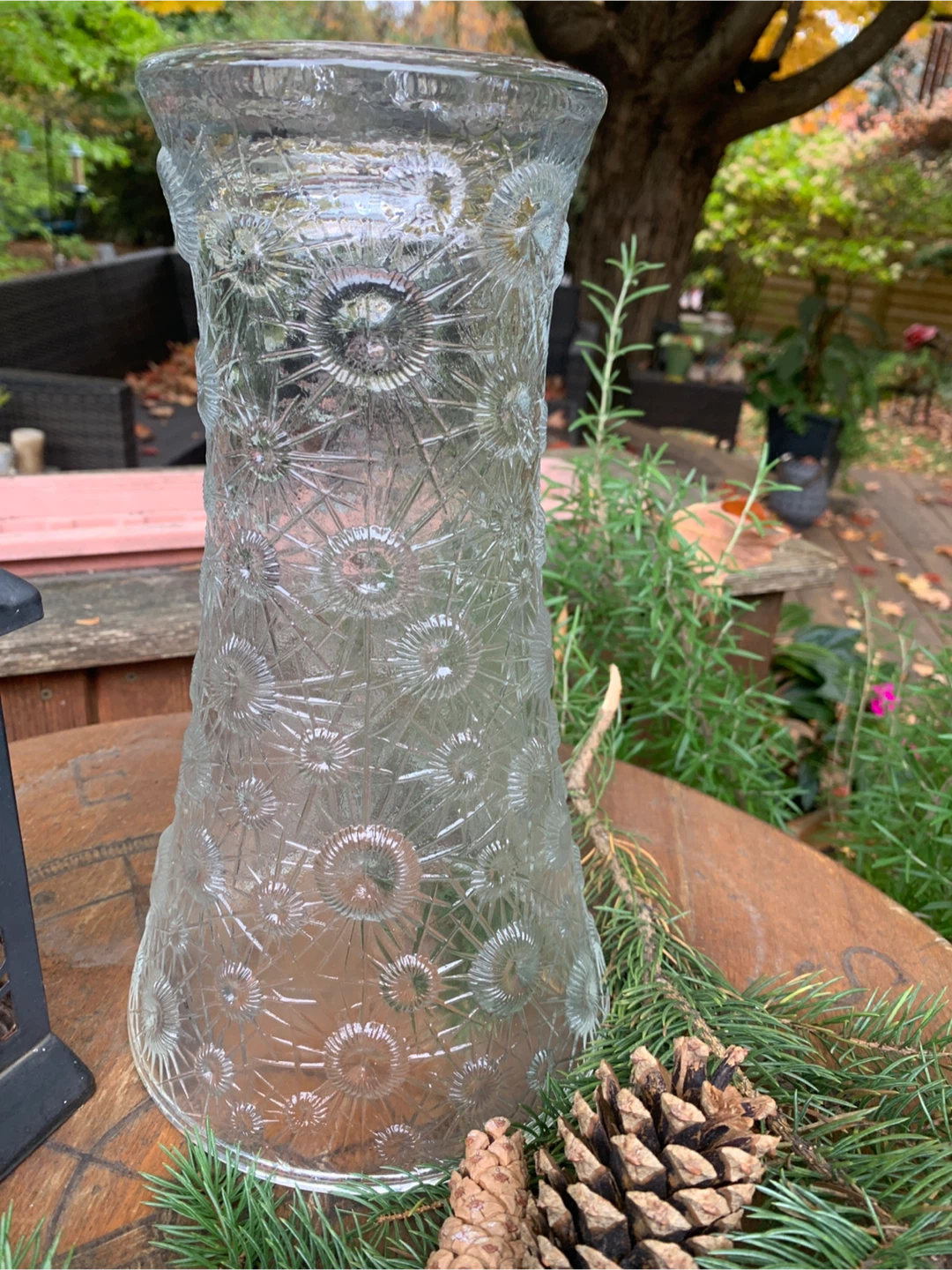 Here is a stunning MCM vintage (late 60’s-1970’s) Czech Scandinavian vase designed by Jiri Repasek. It has the most beautiful starburst/atomic pattern in this pressed crystal and is quite heavy. It is in excellent condition with no cracks or chips. It stands 12” tall and the mouth of the vase is 7”. Perfect for displaying your favourite blooms! A very special piece to own!