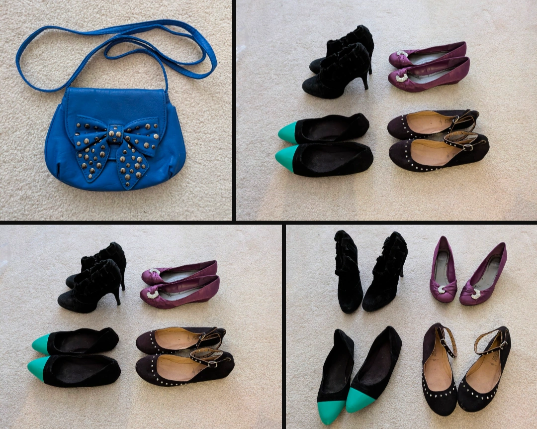 49Selling a collection of women's shoes and a royal blue purse! There are four pairs in total, including black heels, purple full heels, and two pairs of black flats with different embellishments. Bag - Good Condition Shoes (US 7/UK 5/EUR 38) Top two: Clarks Brand - Fair Condition Bottom two: Used - Good Condition All 5 items for $5. Pick Up Markham - can arrange for exact location.