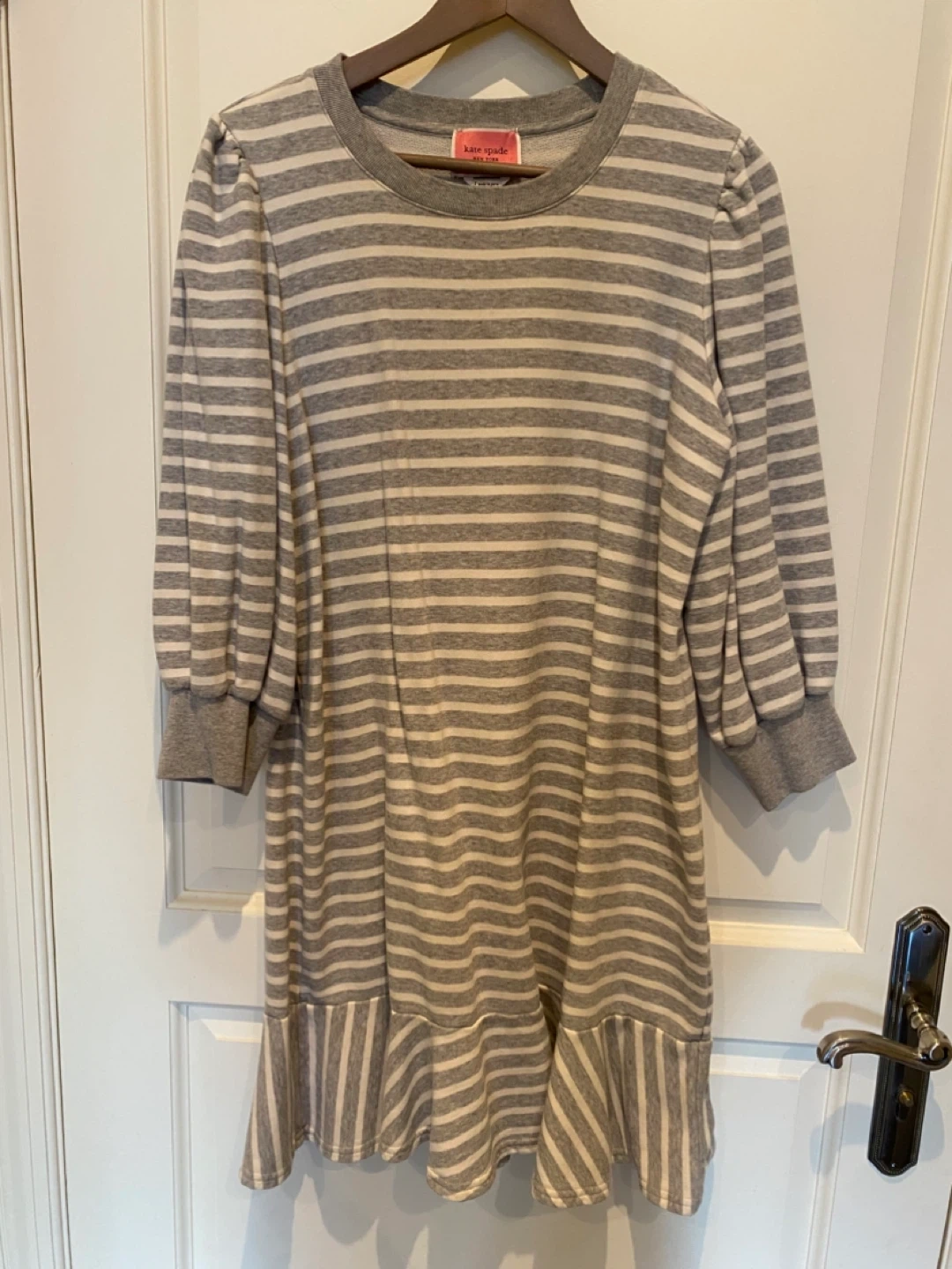 345This is a cute Kate Spade dress with a grey and white striped pattern. It has 3/4 sleeves with a slight puff at the shoulders and a ruffled hem. It's in great condition and ready for a new home!