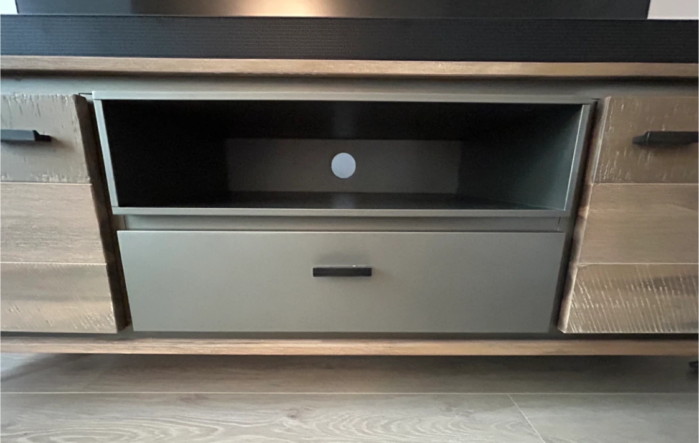 Selling a lovely wooden TV stand with 2 doors and 1 drawer. It's perfect for organizing your living room and adding a touch of warmth to your space.