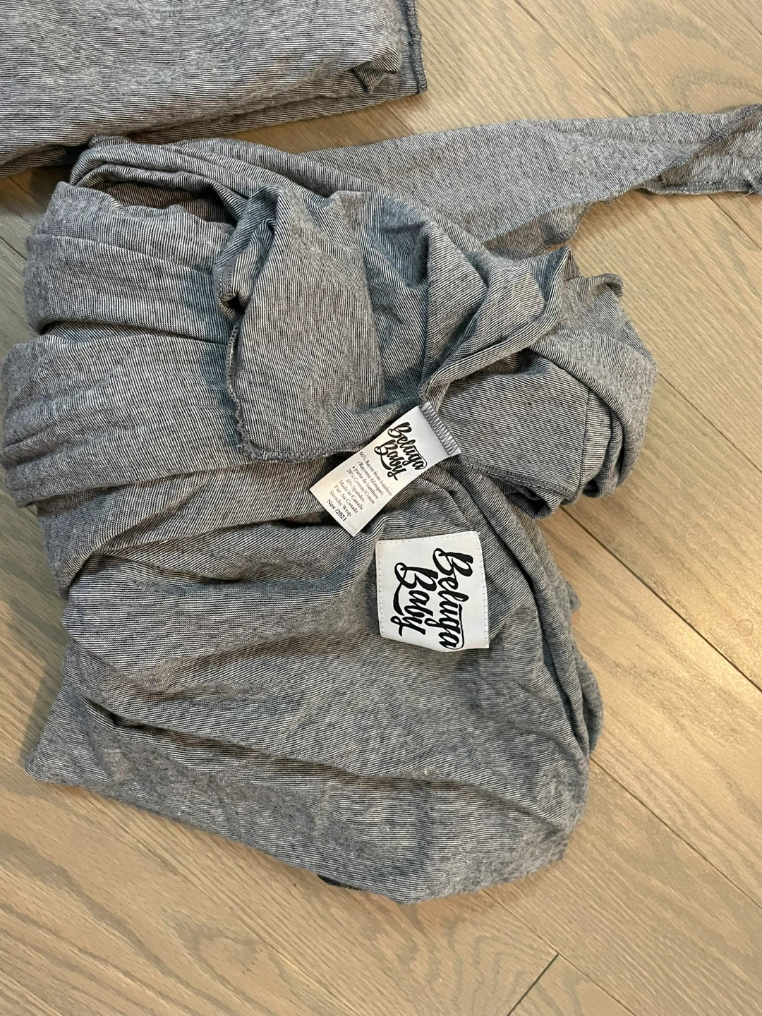 A gently used Beluga Baby Wrap in a stylish grey stripe pattern. Made from soft and stretchy fabric, it's perfect for keeping your little one close and comfortable. The wrap is in great condition and ready for a new home. It's a great way to bond with your baby while keeping your hands free