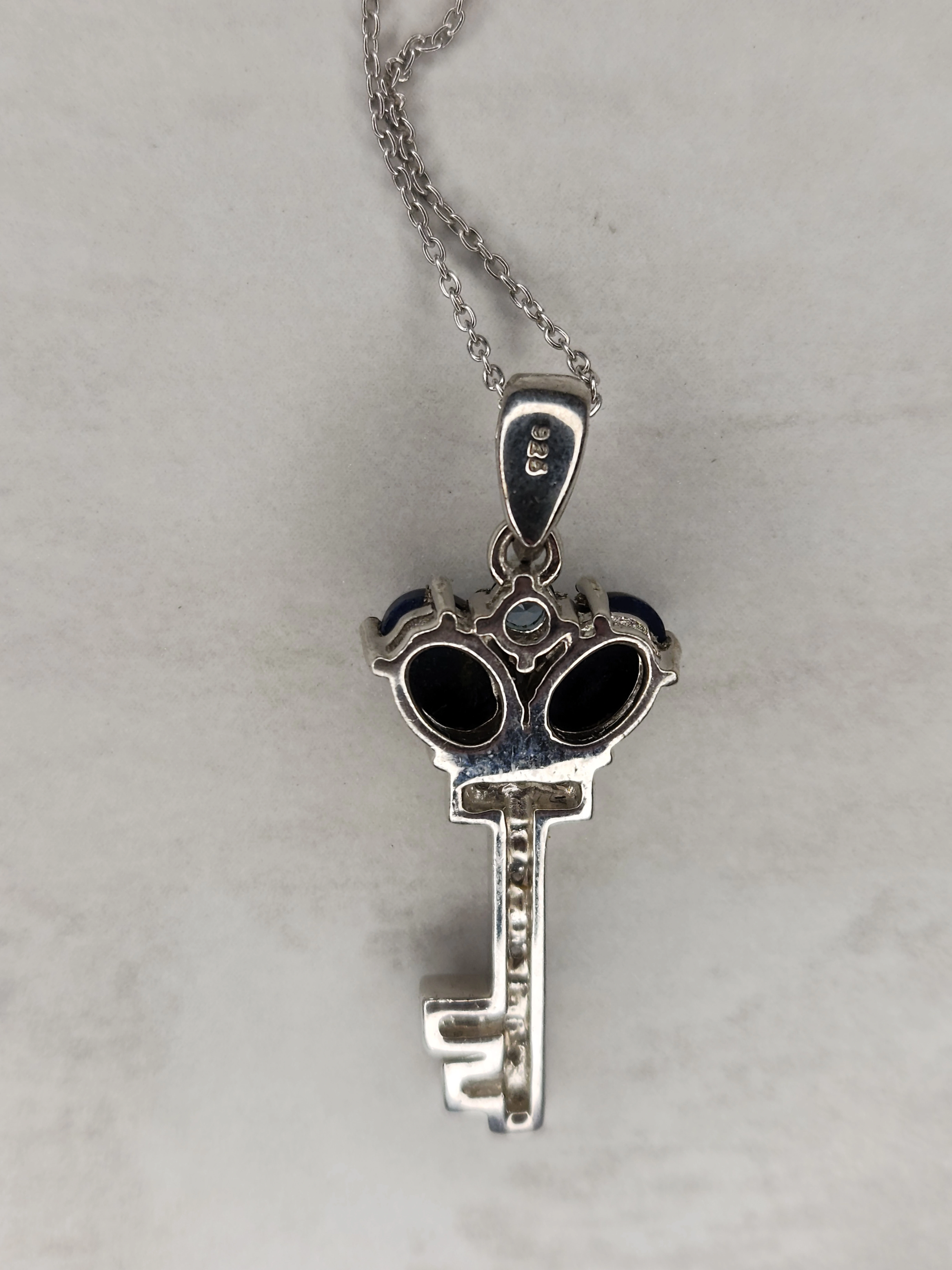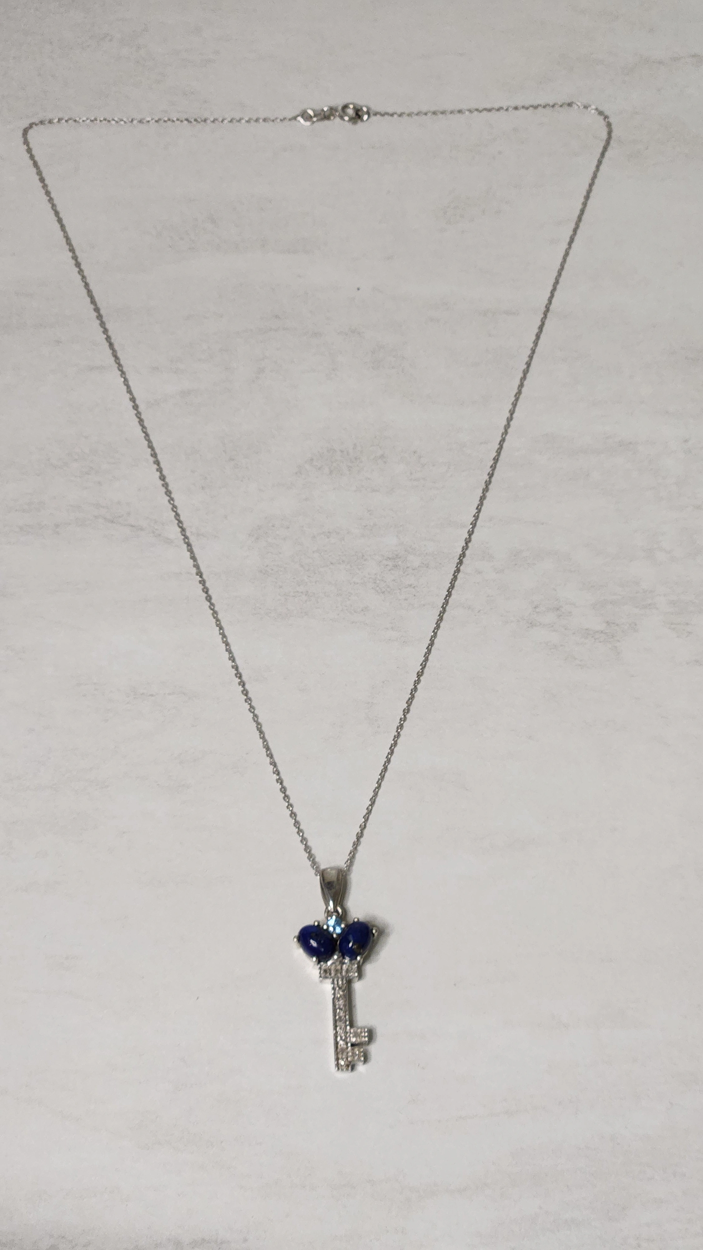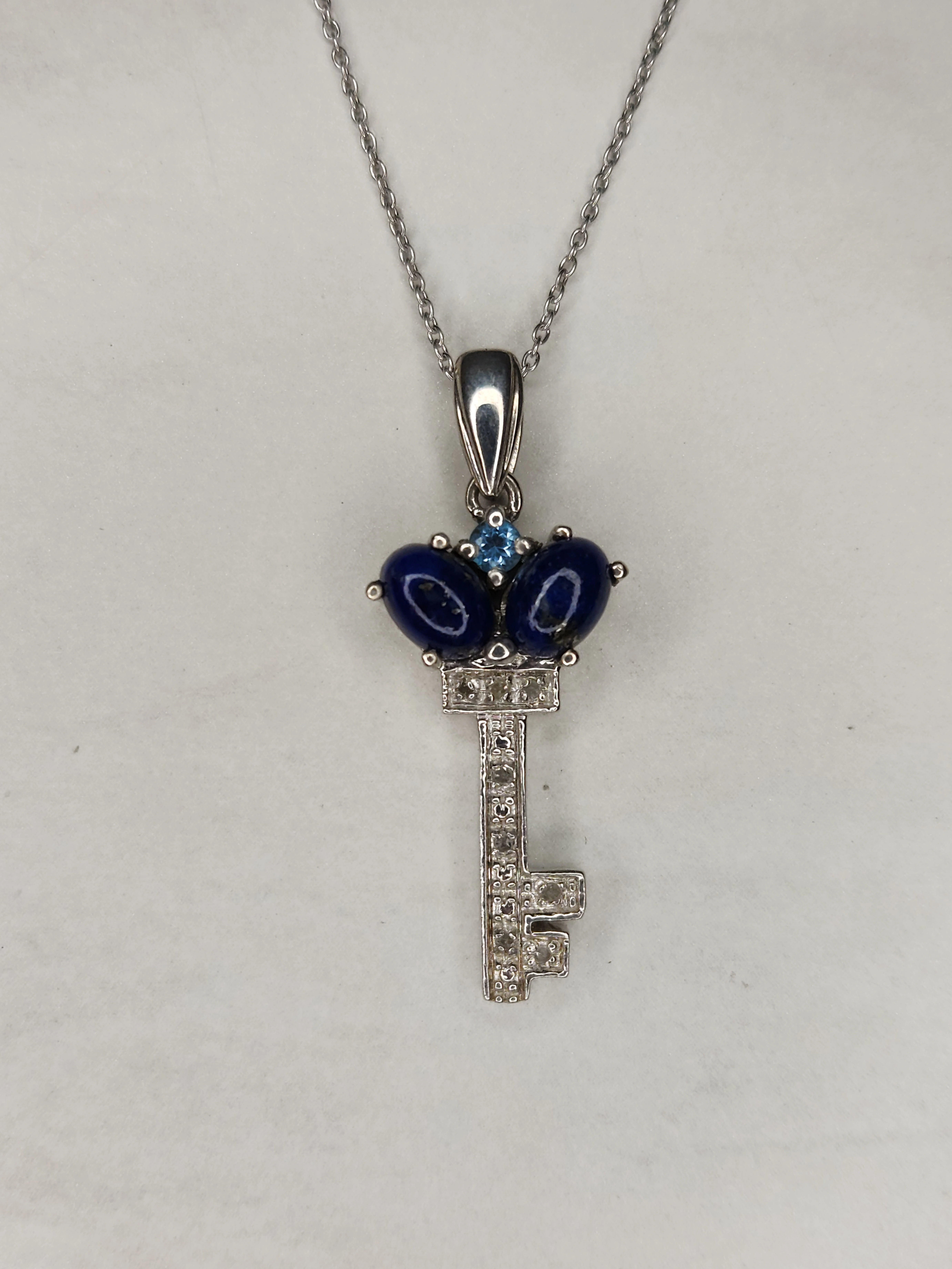 Sterling Key Necklace - Platinum over Sterling Silver - 2 Lapis Lazuli, 1 Swiss Blue Topaz & 7 Diamond, Gemstones