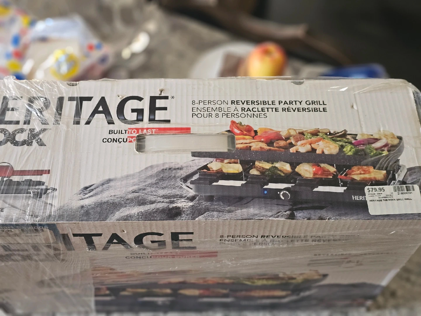 Selling a brand new Heritage The Rock 8-Person Reversible Party Grill! It's still in the box and ready for your next gathering. This grill features a reversible plate and is designed for 8 people. It's built to last and will make cooking fun and easy!