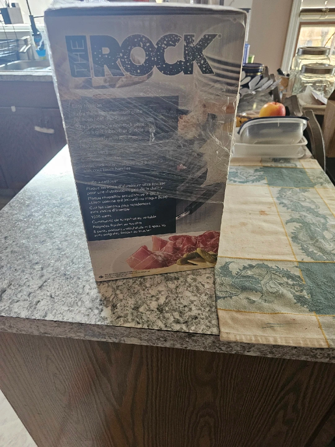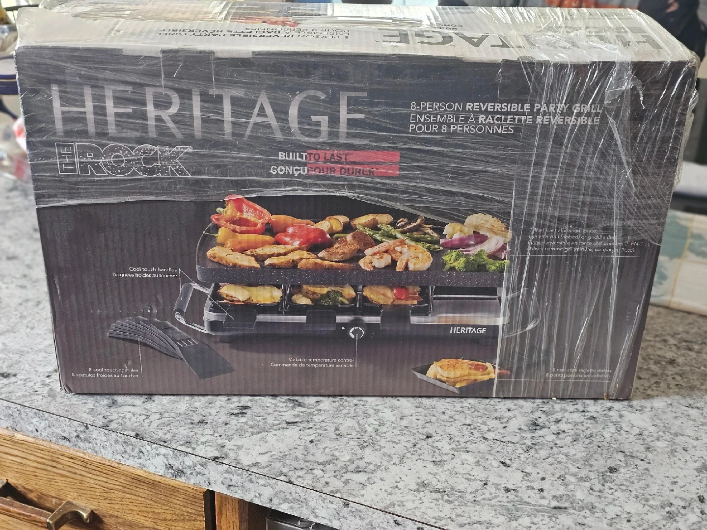 Selling a brand new Heritage The Rock 8-Person Reversible Party Grill! It's still in the box and ready for your next gathering. This grill features a reversible plate and is designed for 8 people. It's built to last and will make cooking fun and easy!