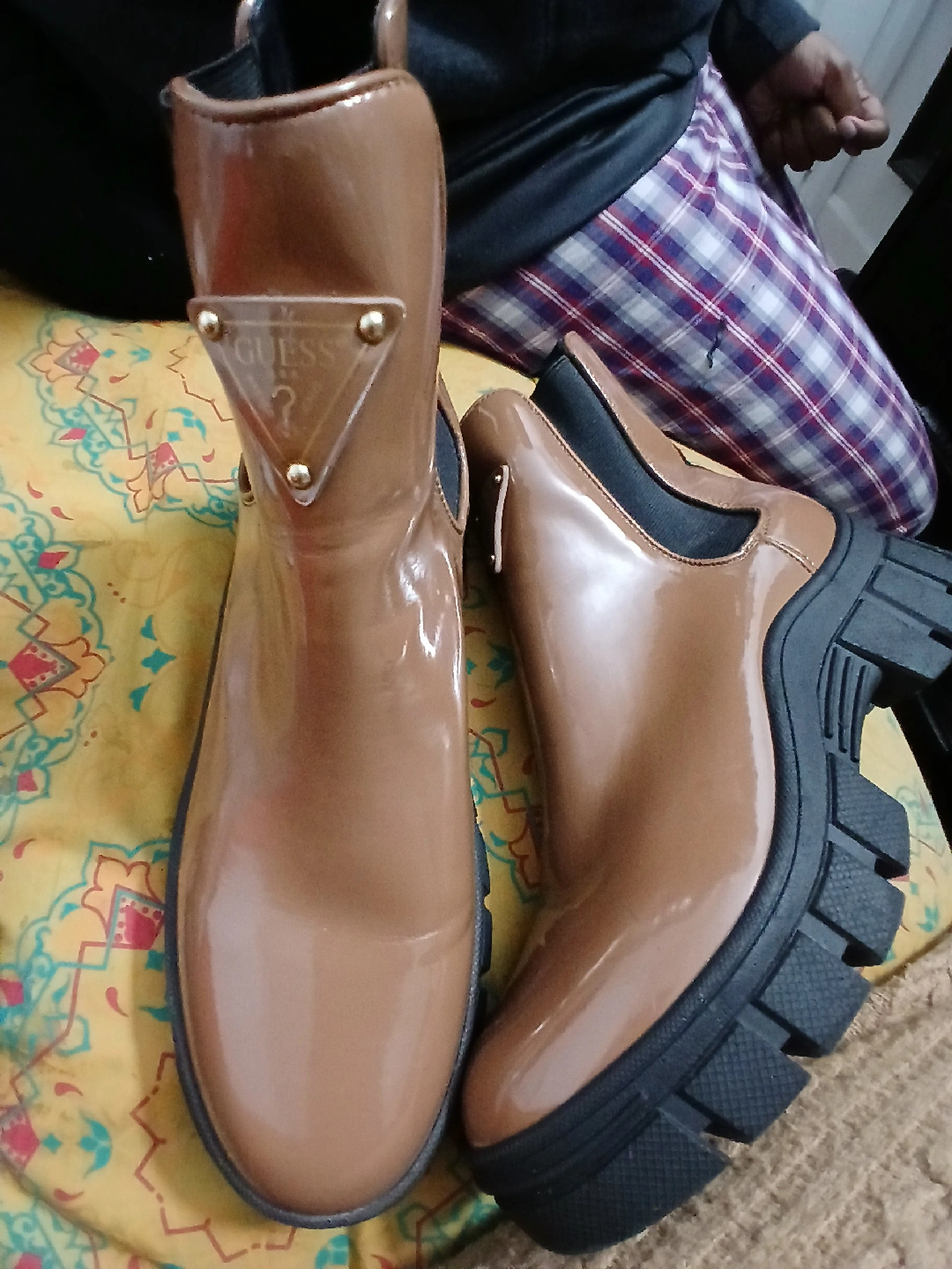 25These are a pair of Guess ankle boots in a lovely brown colour. They feature a chunky black sole and the Guess logo on the side. Great for adding a bit of edge to any outfit!