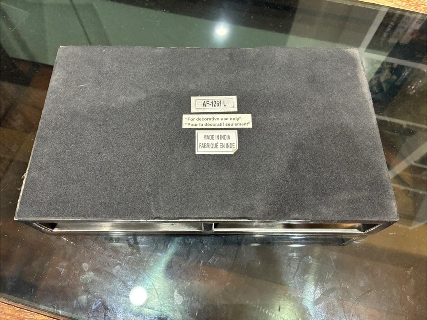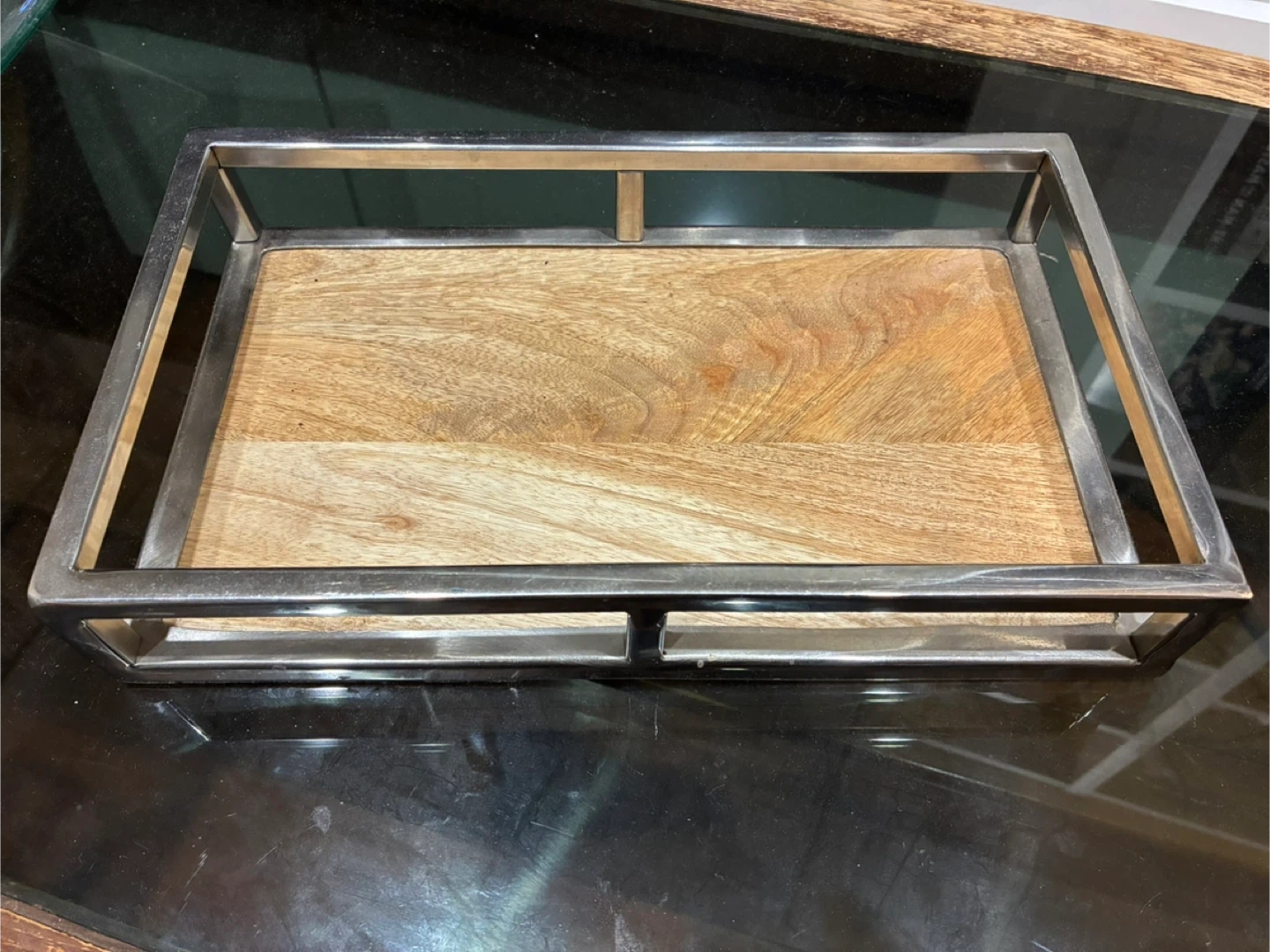 A decorative tray featuring a wooden base and a sleek metal frame! Sturdy and hefty in weight. Made in India
