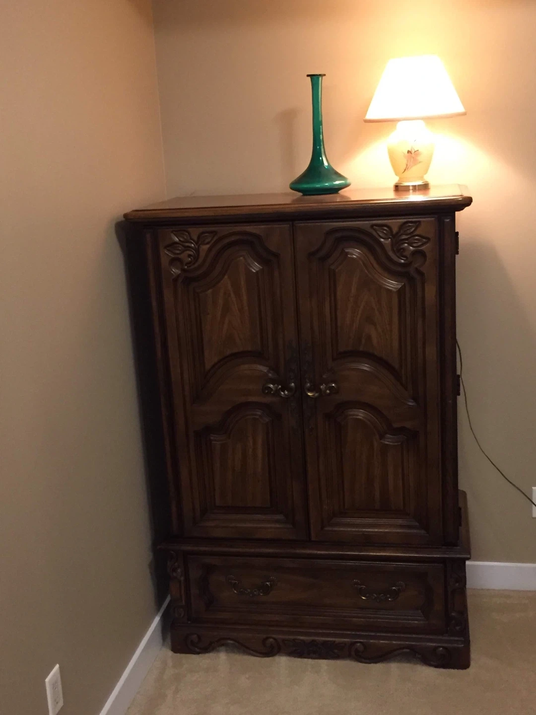 106Dark wood armoire with ornate detailing on the doors and drawer. It has interior shelves and a bottom drawer for storage. Perfect for adding a touch of vintage charm to any room!