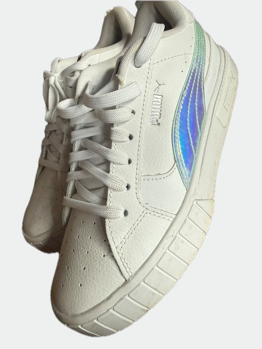 Selling a pair of Puma CA Pro Holo sneakers in white! These are in great condition and feature a cool holographic stripe on the side. They're a women's size 6 (US). The box is included!