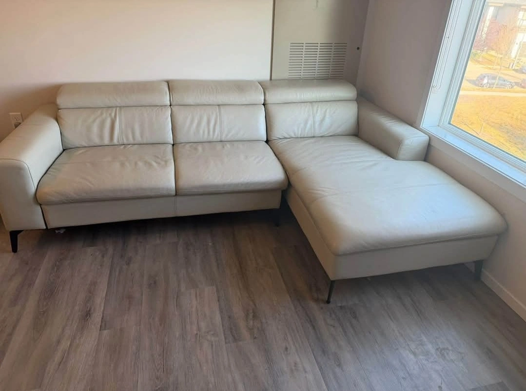 Selling a comfortable beige leather sectional sofa. It's in great condition and would be a perfect addition to any living room. The sectional design offers plenty of seating and a relaxing chaise lounge. The neutral colour ensures it will match any decor