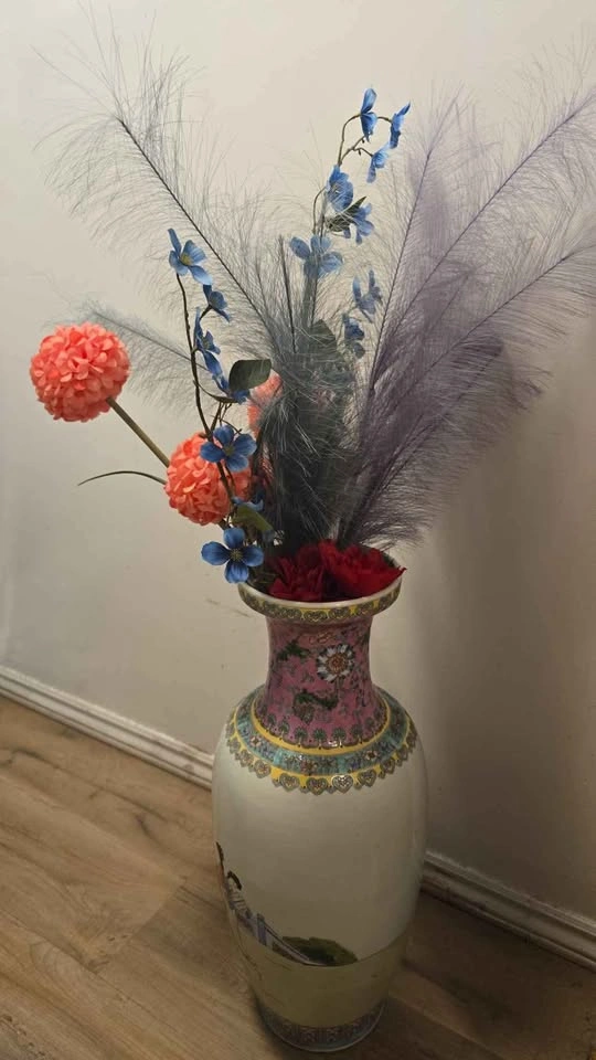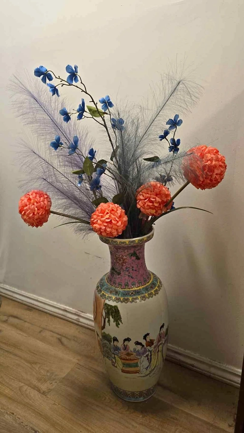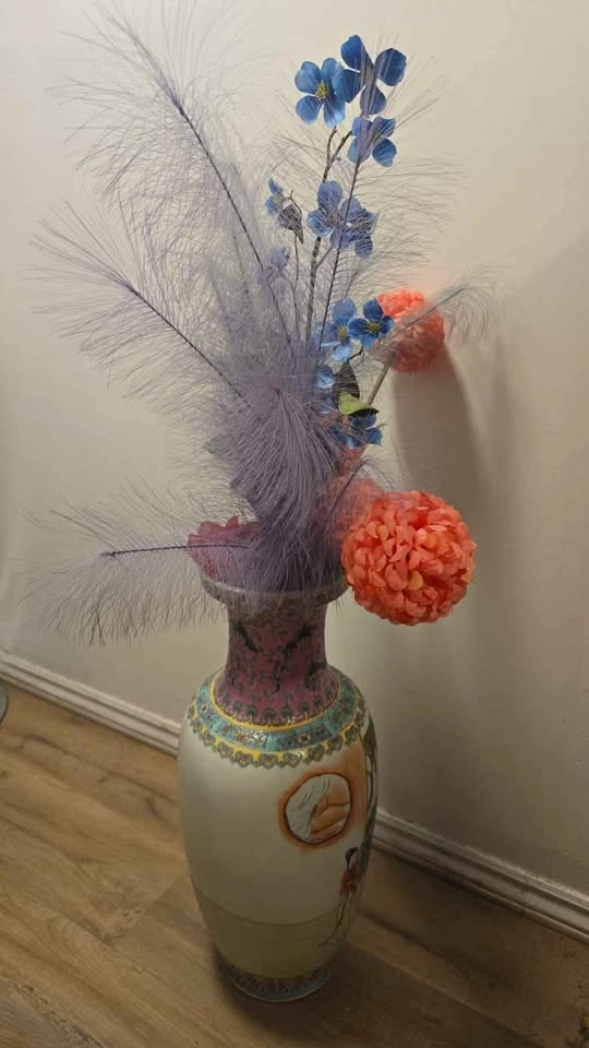 65Beautiful tall ceramic vase featuring traditional Asian artwork of elegant women in classic attire. The vase is in excellent condition and comes with a full set of artificial flowers — pink, blue, and red with decorative feather accents. Perfect for enhancing your home décor, entryway, or living room. Measurements: •Height: 61 cm •Diameter: 16.5 cm Material: Ceramic Condition: Gently used, no cracks or chips Includes: Artificial flowers shown in the photo 📍Pickup: 1300 Mississauga Valley Blvd